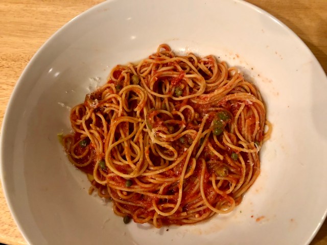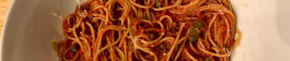 Spaghetti alla puttanesca or spaghetti in the style of the prostitute is from the Campania region of Italy. The biggest city in the region is Naples, home to pizza, and a place which we were planning to visit towards the end of our trip. The Campania region is at the front of the ankle on Italy’s boot.