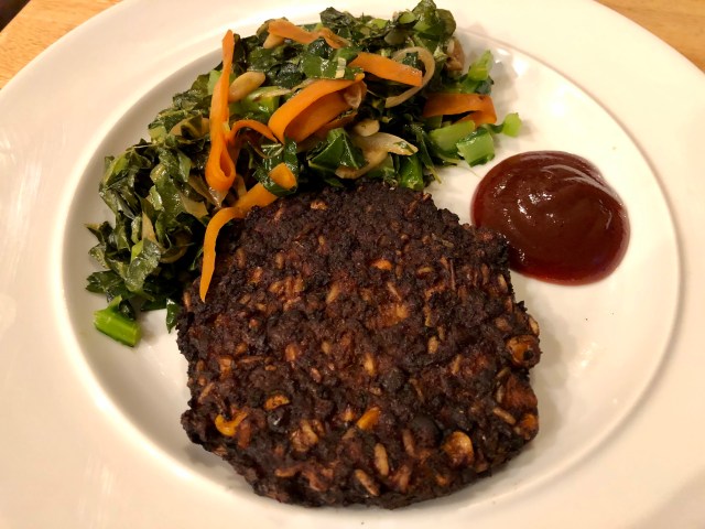I cannot take any credit for the chipotle bean burgers since they are made by Morningstar and cooking them is just one minute on each side on high in the microwave. I served mine with a little barbecue sauce and John had his on a hamburger bun. The vegetable is a different story, though. Usually I make collard greens by toasting some garlic in a little oil and then sautéing the ribbons of collards with some corn. I often add a little sugar if they are particular bitter and a little vinegar for some acid. Last night I cut strings of onions, sliced the garlic, and added carrot peelings to the mix. John also asked me to dice up the stems so I had to boil them in a little water first so they wouldn’t be hard. I added the little bit of sugar and vinegar and completely forgot the corn. The collards were really good and were the star of the plate.