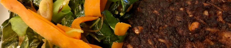I cannot take any credit for the chipotle bean burgers since they are made by Morningstar and cooking them is just one minute on each side on high in the microwave. I served mine with a little barbecue sauce and John had his on a hamburger bun. The vegetable is a different story, though. Usually I make collard greens by toasting some garlic in a little oil and then sautéing the ribbons of collards with some corn. I often add a little sugar if they are particular bitter and a little vinegar for some acid. Last night I cut strings of onions, sliced the garlic, and added carrot peelings to the mix. John also asked me to dice up the stems so I had to boil them in a little water first so they wouldn’t be hard. I added the little bit of sugar and vinegar and completely forgot the corn. The collards were really good and were the star of the plate.