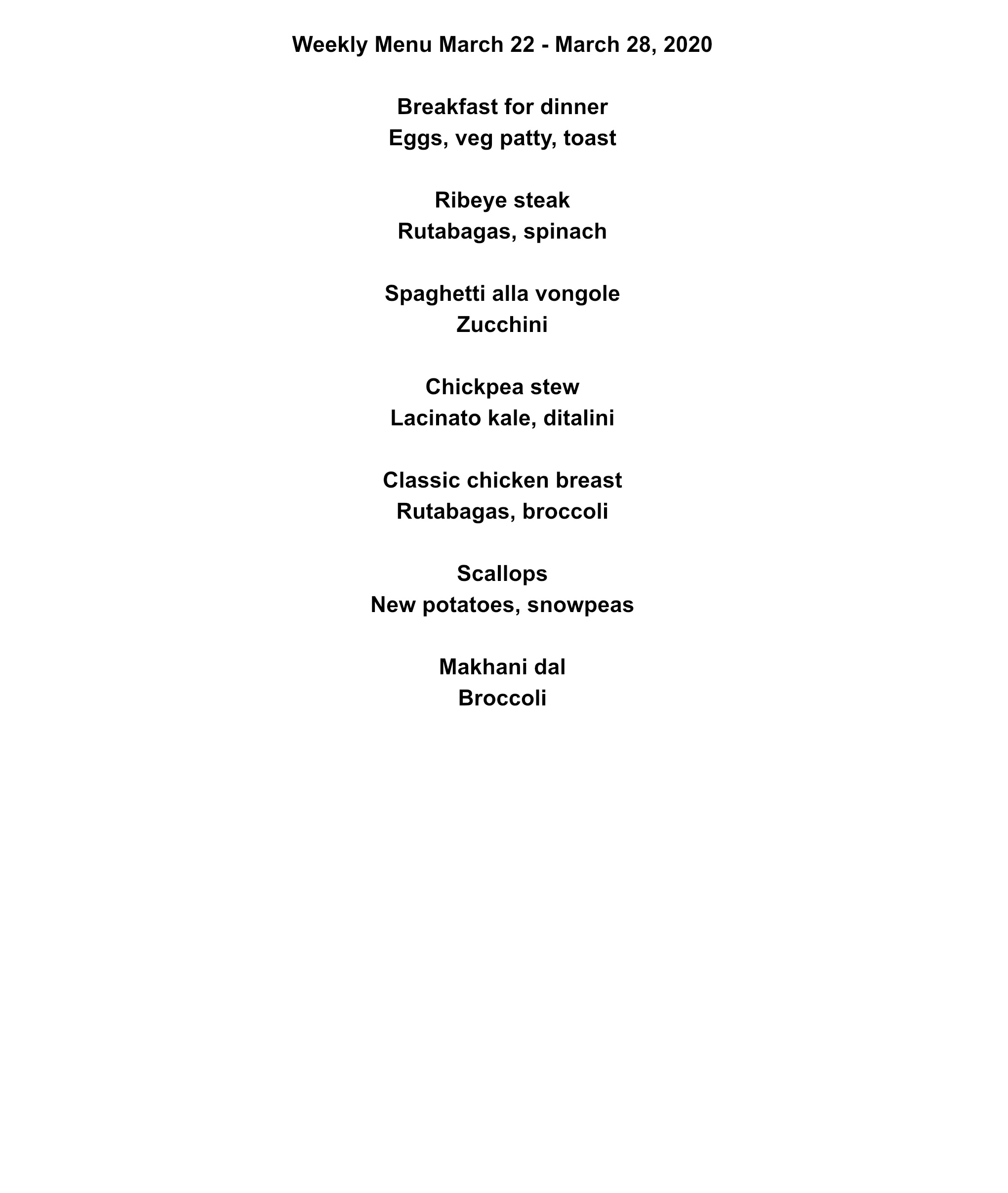 Since I assume that everyone is sheltering-in-place by now (even though we have already been doing it for a week), I am proposing a week of comfort food.  This week’s dinners are comprised of three vegetarian or vegan dishes, two shellfish, one red meat, and one chicken meal. All are familiar dinners we’ve had before with the exception of Makhani dal which is a lentil dish so I am sure it will be a winner as well! Be kind to yourself and eat things you like, practice social distancing, and stay well.