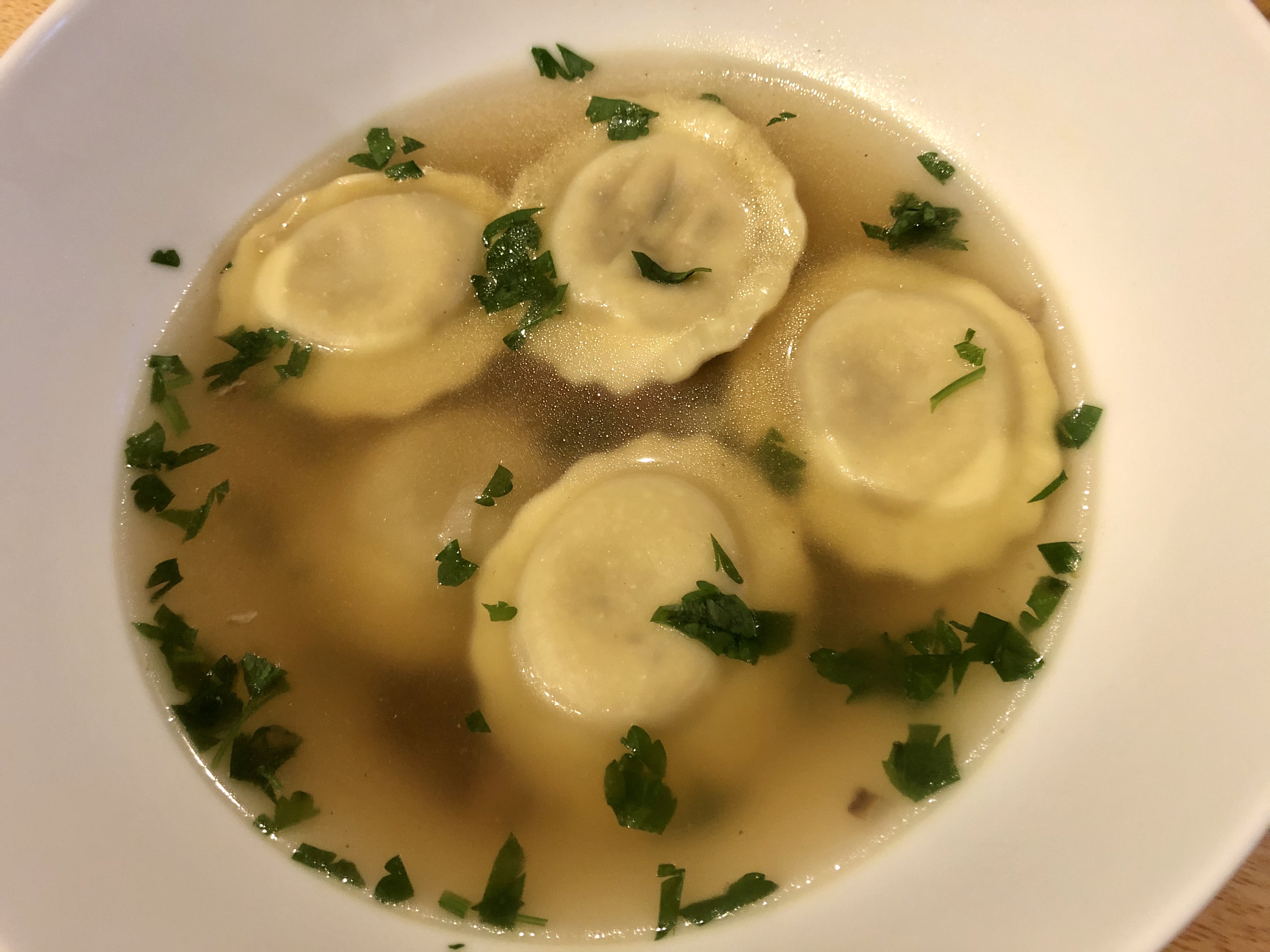 Anyway on Monday night we had agnolini which are circular ravioli type pasta. We bought them pre-made in the fresh pasta section of the grocery store. They were served in a veg broth with carrots, onions, celery, and mushrooms. The agnolini were stuffed with a mushroom purée. This dinner was easy and good!