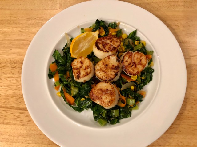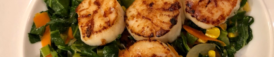 Instead of having the usual scallops, potatoes, and collard greens, I expanded the veg and cut out the starch. I know that as I approach my goal weight-wise it becomes more difficult to lose weight so I have to cut calories where I can (without giving up my beloved popcorn!) The vegetable turned out pretty well. I chopped up the collard stems and added them to the pan first with onions, the frozen corn, and chunkier pieces of carrots. After about 5 minutes I put in the collard leaf chiffonade and the thin slices of carrot. The dish was seasoned with some garlic powder, salt, a dash of sugar and vinegar, plus light butter. I made a bed of the colorful vegetable melange for the yummy seared scallops to sit on. Such a good meal!