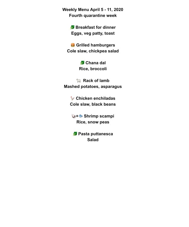 When I mentioned to John that there was nothing new on the menu this week he said that it had been so long since we have had hamburgers that it was like something new. Okay, he has a point there. So this week we have 3 vegetarian dishes, 2 meat dishes, 1 chicken, and 1 shellfish. I hope it gives you some ideas on what to cook whether you are just starting your quarantine or have been at it like we have for four weeks. Stay home and stay healthy