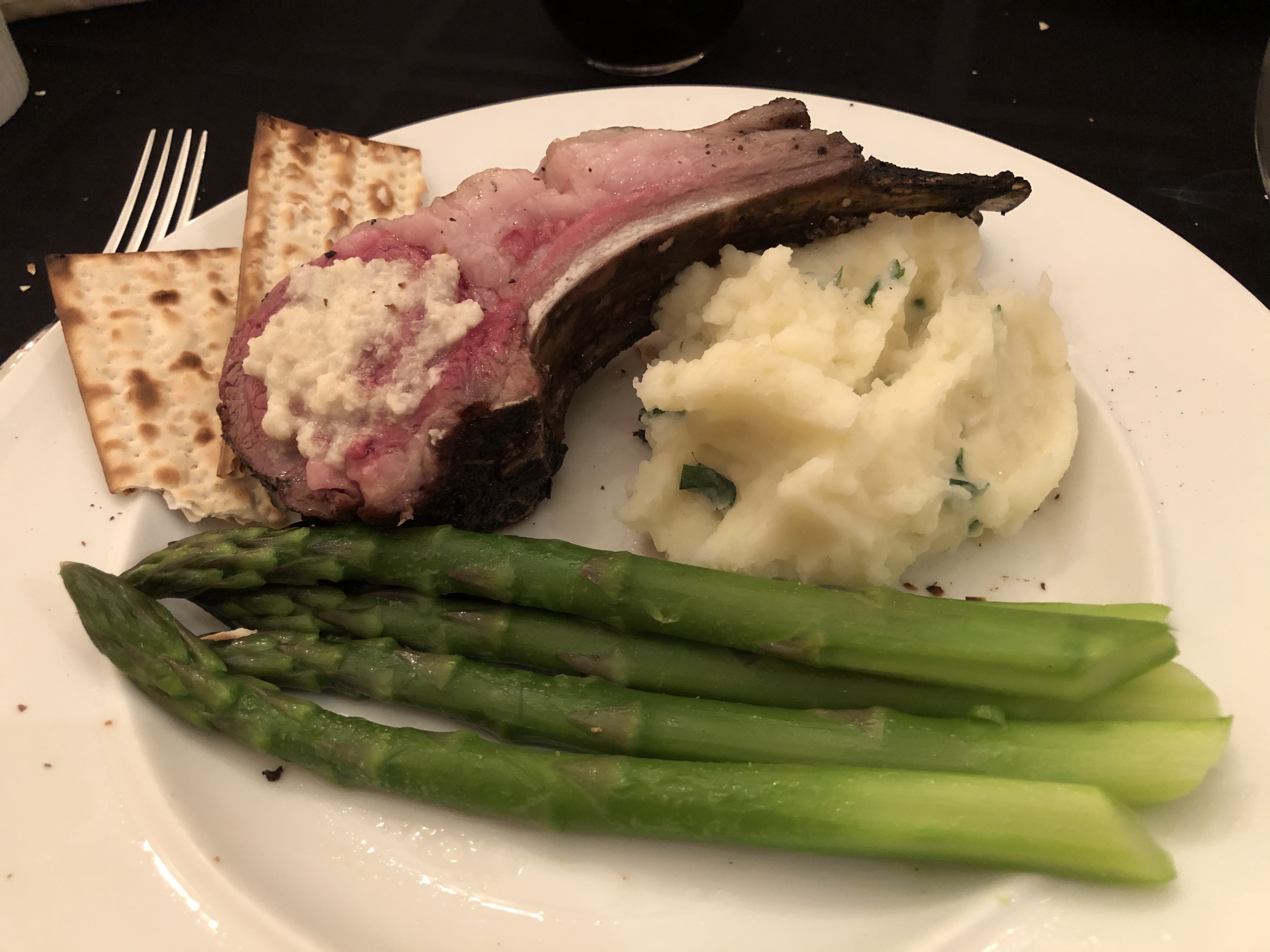 We had a delicious Passover dinner with a rack of lamb that John sous vide and then finished on the grill, buttery mashed potatoes, and asparagus. It was a very springtime menu. We threw the diet out the window for one night and just enjoyed our dinner. Celebrating once in a while will not make you overweight. Celebrating every day will!