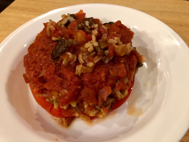 Back at the beginning of the lockdown due to the pandemic, we bought some ground beef and portioned out into 5 ounce servings. That is enough for one hamburger or enough as a flavoring in a larger dish. So on Tuesday I defrosted one portion and made a stuffed pepper that contained a mixture of brown rice, onions, mushrooms, and the 5 ounces of beef. That equals about one-ish ounce of beef in each pepper half that I filled. I made my own tomato sauce so I could control what went in it and we each enjoyed one half of a pepper. It has been sometime since I made stuffed peppers this way and it was a streamlined comfort meal for me.