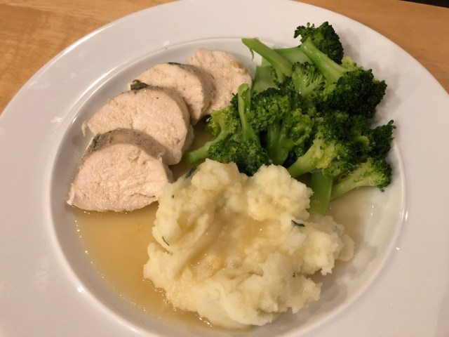 We had a small change-up to our classic chicken dinner this week. Our daughter has tarragon growing in her garden and we asked her to bring some home. When John sous vide the chicken breast he added some leaves of tarragon, some olive oil, and a bay leaf in the vacuum sealed bag and set the circulator for 160F. We let it cook at that temperature for around 1.5-2 hours. It came out with a mild tarragon flavor and we also used the tarragon-y juice from the chicken with some additional stock as a gravy. It was great on the mashed potatoes which were leftover from last week. Basically all I had to do was cook the broccoli which only took a few minutes. Easy dinner for me!