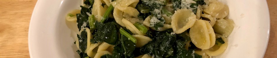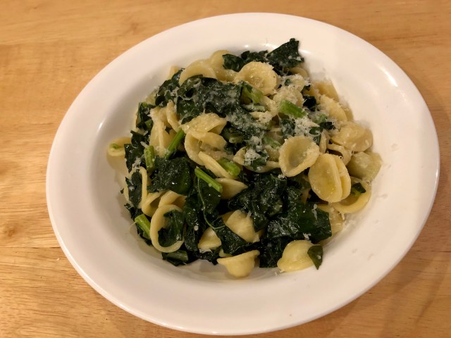I made orecchiette with Lacinato kale for dinner last night. I blanched chopped up kale stem pieces (in the pasta water) and then cooked them with onions and garlic. When the pasta was nearly ready I added the leafy greens and let them wilt. Then came the orecchiette with some reserved pasta water. The greens were pretty bitter so I added a dash of sugar and a teaspoon of olive oil, not nearly as much as my Giampaolo dish! A sprinkling of parmesan (If you are not vegan) and a drizzle of good olive oil finished the dish.