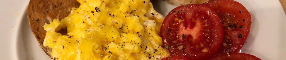 Yes! You can eat breakfast for dinner! I usually have BFD every Sunday. It gives me a day off from actual cooking. John and I each make our own meals. His is usually some sort of fancy omelet while I am a plain scrambled egg kind of person. I have tried making omelets and over easys, and even exotic scrambles but what I like best is just a humble scrambled egg. Last night I took a little egg-tra care and tried to cook my eggs soft with small curds but usually I am in too much of a hurry to worry about them being perfect.