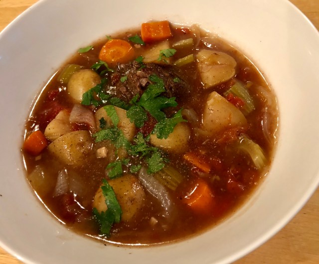 Take your favorite beef stew recipe. Set the Instant Pot on sauté and brown your meat. We used half of a chuck steak. Add your vegetables, add liquid, and herbs and seasoning. Change the setting to pressure cook and the time for 18 minutes. When the cook time is done let the pressure reduce on its own for at least 10 minutes. Release the rest of the pressure. Open the Instant Pot and add a thickening agent so your gravy has a nice viscosity, adjust the seasoning, and enjoy!