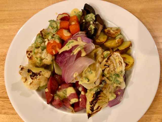 I really like making these sheet pan dinners. Roasting vegetables makes them delicious and the clean-up is as easy as crumpling up the piece of aluminum foil you cooked them on. To start cut up your vegetables and put them in a large bag or bowl, add olive oil and salt, and toss them to coat. Put the harder vegetables such as potatoes and carrots in a 425F oven and give them a 10 minute head start. Then spread the rest on the sheet pan and let it cook for another 20 minutes. Test for doneness. Serve with mustard sauce.