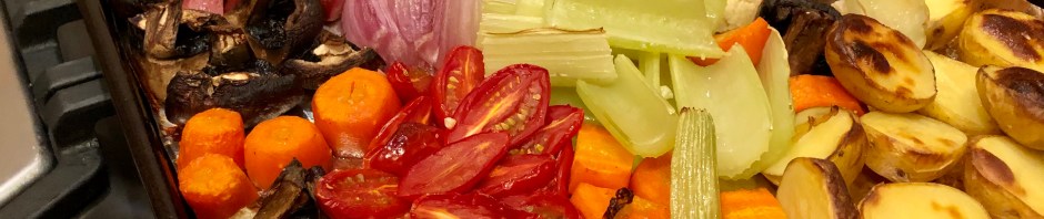 I really like making these sheet pan dinners. Roasting vegetables makes them delicious and the clean-up is as easy as crumpling up the piece of aluminum foil you cooked them on. To start cut up your vegetables and put them in a large bag or bowl, add olive oil and salt, and toss them to coat. Put the harder vegetables such as potatoes and carrots in a 425F oven and give them a 10 minute head start. Then spread the rest on the sheet pan and let it cook for another 20 minutes. Test for doneness. Serve with mustard sauce.
