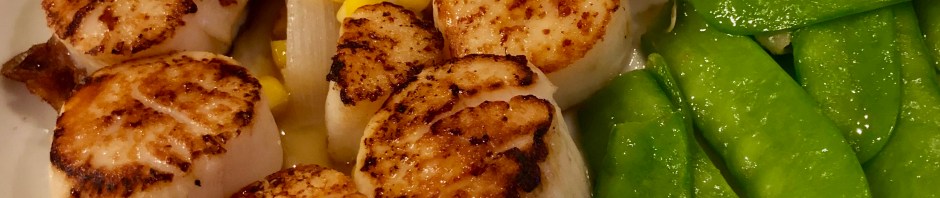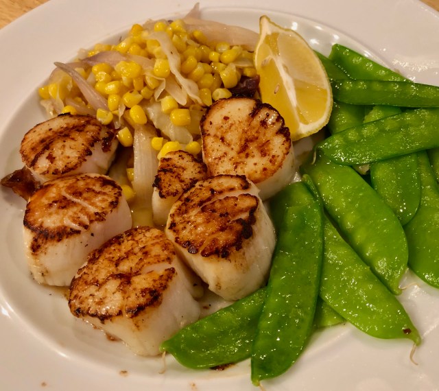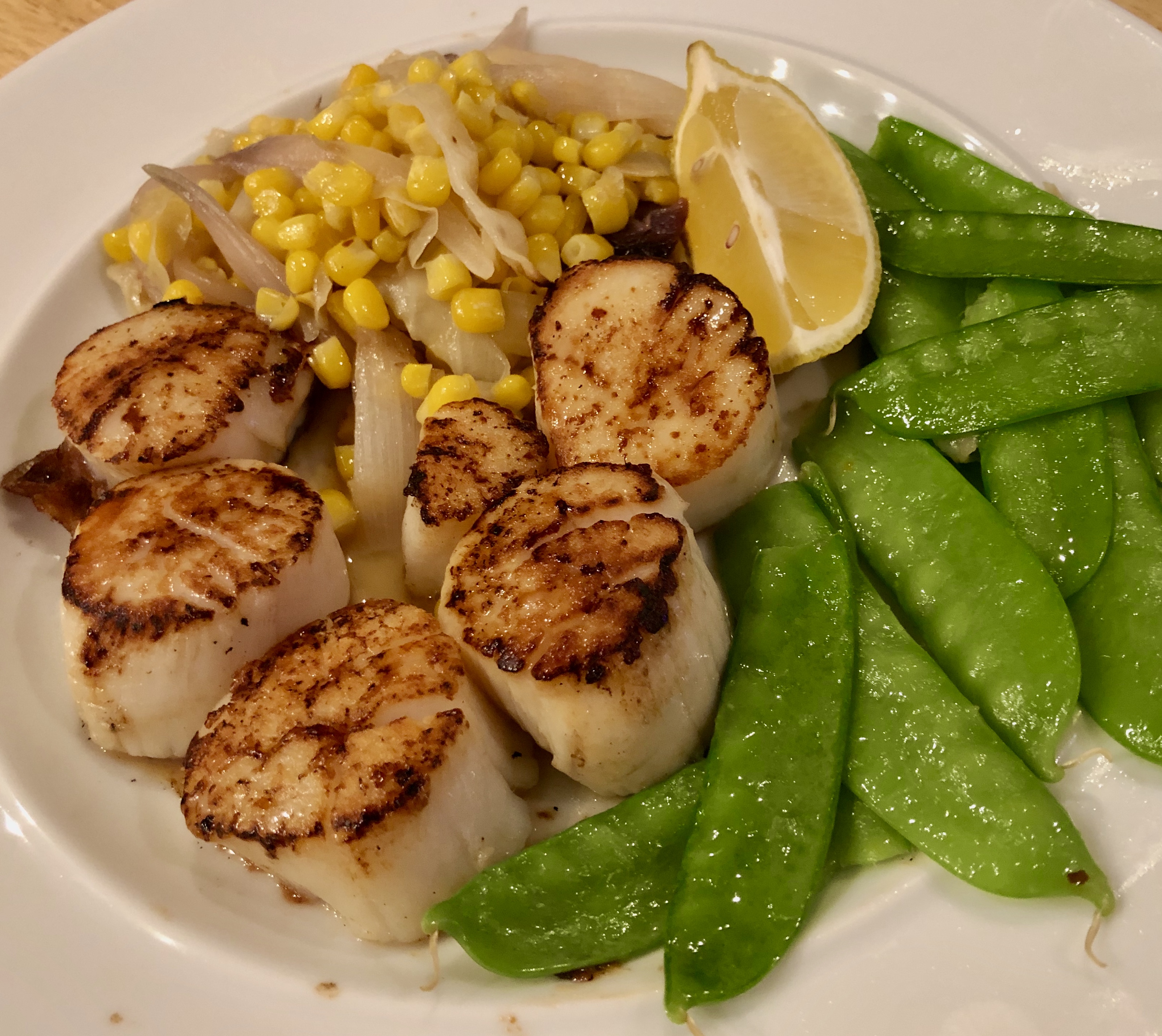 We have a division of labor in our house, John cooks the animal proteins while I take care of the vegetable proteins and veggie sides. Tonight John made his superb seared scallops in a cast iron pan while I sautéed the snow peas in some faux butter and enhanced frozen corn with the roasted onions and cabbage from last night. A squeeze of lemon finished off our plates.