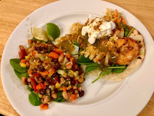 Shrimp tacos with southwest cole slaw and Texas caviar