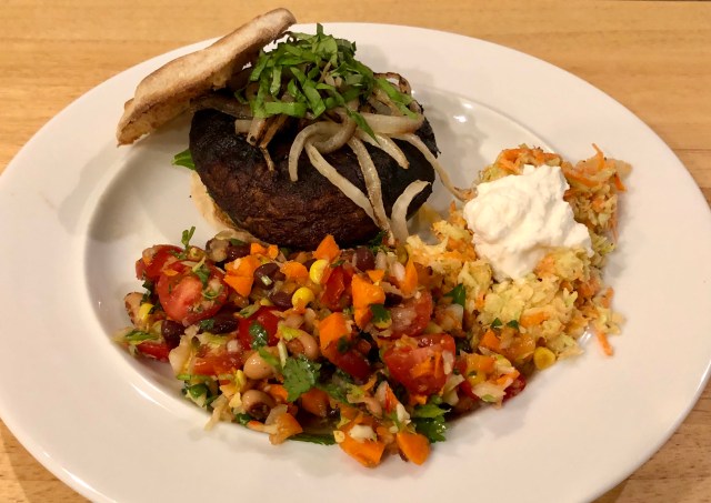 The marinated and grilled mushroom is topped with a seared onion slice and a chiffonade of basil on an English muffin. I made the chopped coleslaw and Texas caviar mostly in the food processor. That is a scoop of Greek yogurt on the coleslaw.