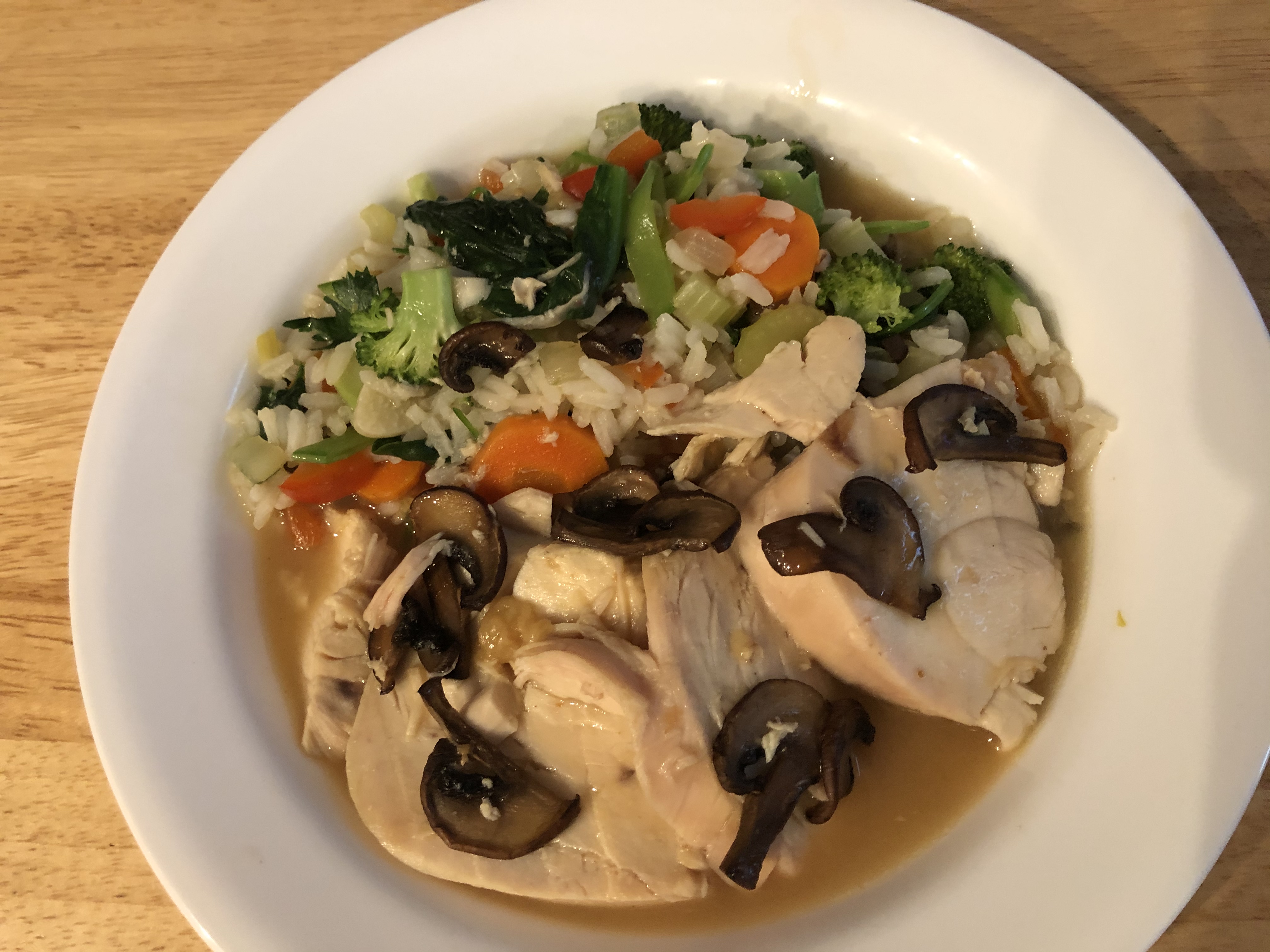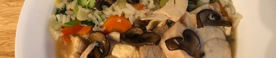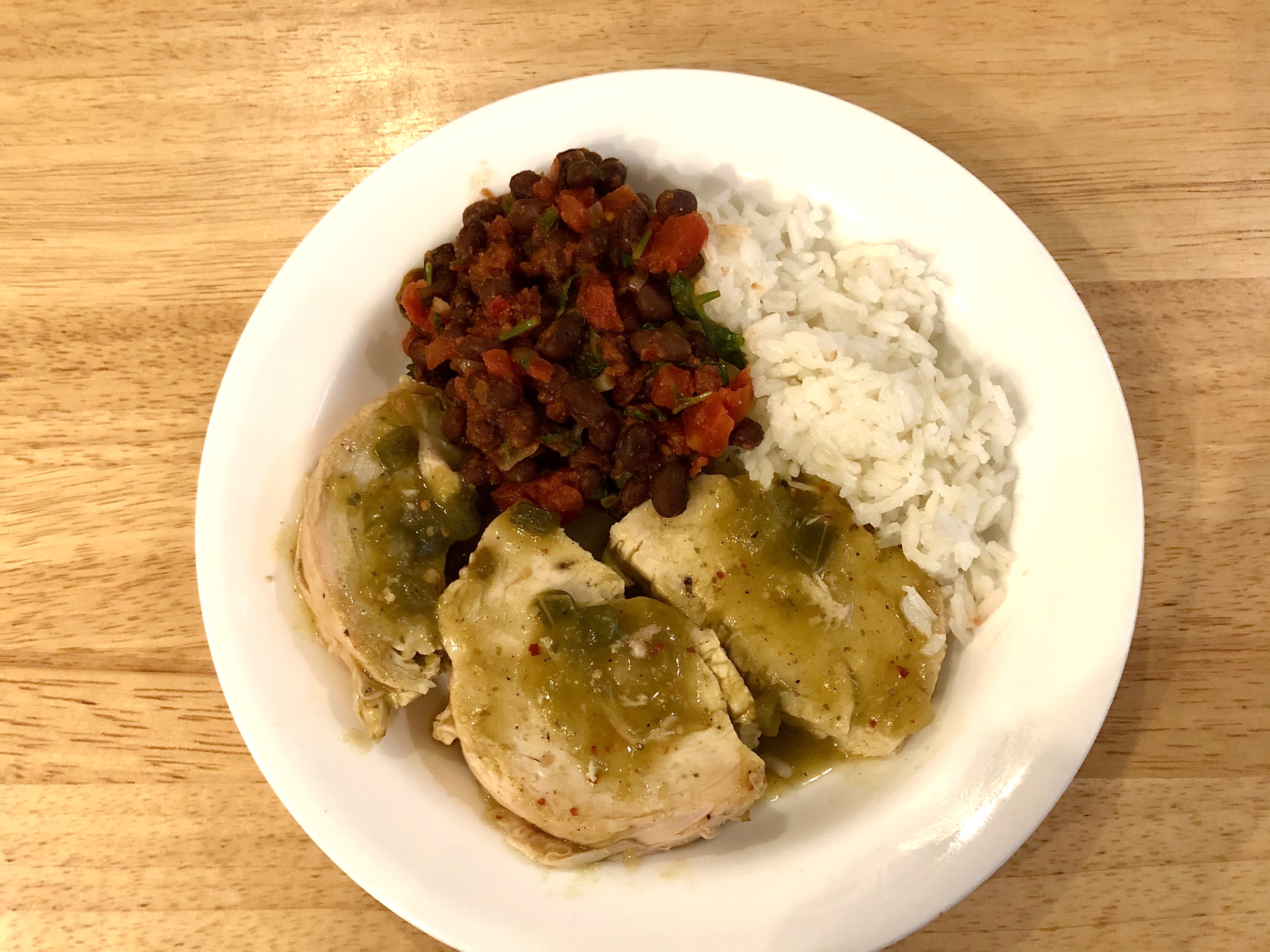 This has turned into “Chicken Week.” I should not have started with chicken on Monday because we went to Costco on Tuesday and I was seduced by the smell of their rotisserie chicken. So to eat up our enormous, economical, savory roast chicken we made un-chiladas (chicken slices with salsa verde but no tortillas) on Tuesday and chicken breast with confetti rice (not enough leftover rice augmented with a bunch of vegetables) on Wednesday.