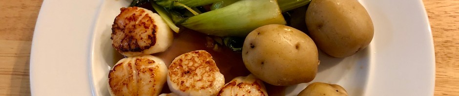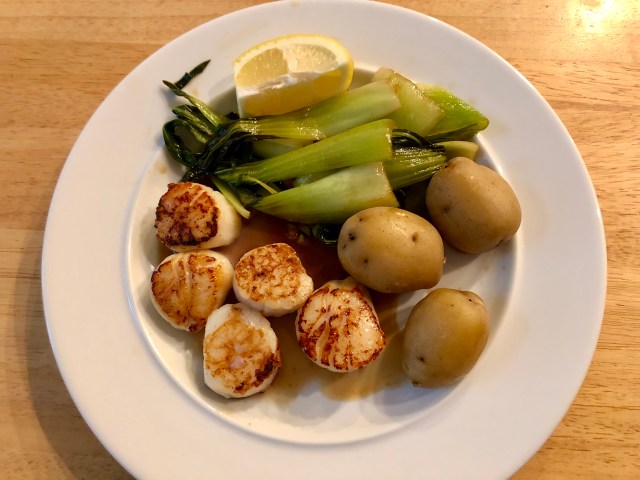 Scallops, new potatoes and bok choy with oyster sauce