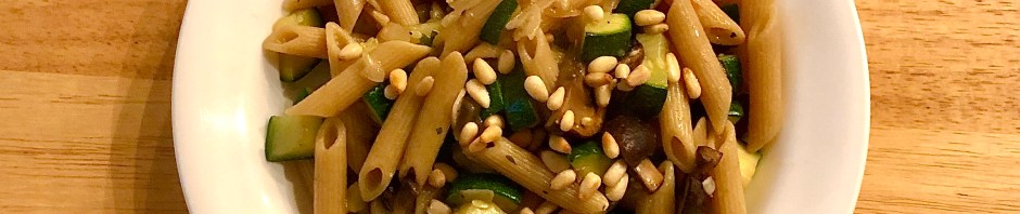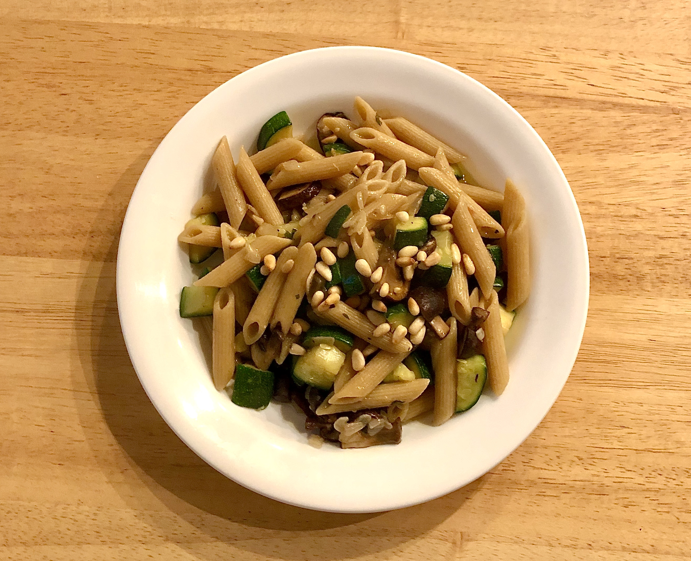 Add the penne to the zucchini/mushroom mixture. Cook together over medium high 3-5 minutes adding some pasta water to make a thin sauce. Taste. Season. Add the herb, parmesan if desired, sprinkle with the pine nuts, and drizzle with finishing oil.