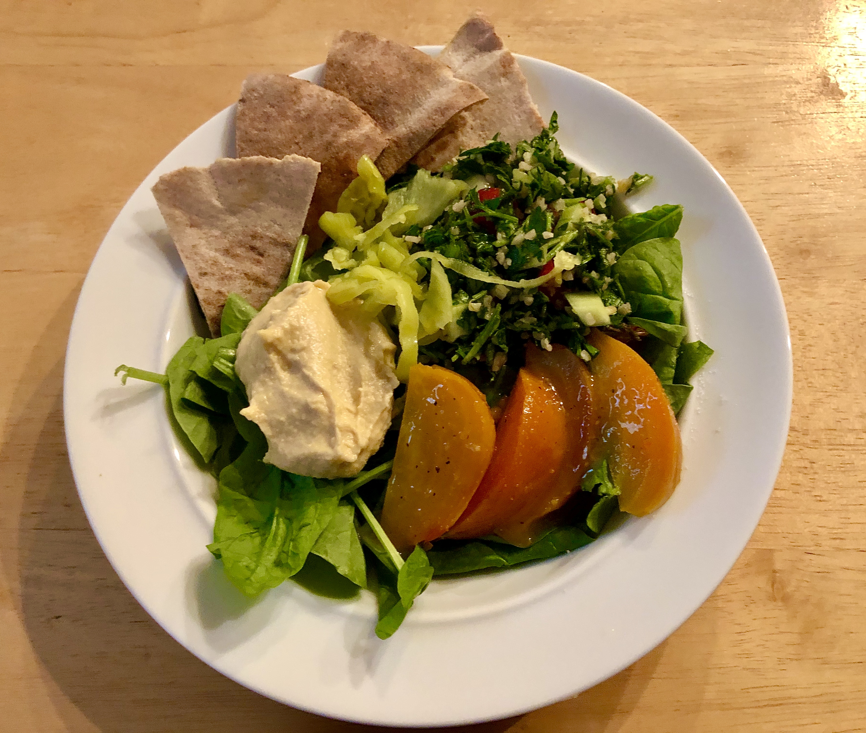 To finish off our vegetarian/vegan week I made a great dinner for a hot night, hummus with tabbouleh and golden beets. I bought prepared hummus, roasted the golden beets in the morning, and made a Lebanese tabbouleh which is heavy on the parsley and mint and light on the bulgur. I put everything on a bed of spinach and included some small pieces of pita and pepperoncini.