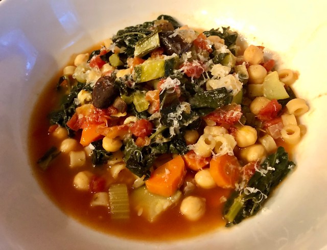 This is one of John’s favorite things to eat. If I ask him what vegetarian dish he would like to have, he invariably chooses this chickpea stew. We load up our stew with lots of vegetables to make it even hardier. There are onions, carrots, Lacinato kale, celery, tomatoes, zucchini, and mushrooms in this rendition. The pasta is really just a bit player with only 2 ounces in the whole dish. If we were regular eaters we would probably get between 4-6 servings out of a potful. But since we are big eaters we end up with enough left over for one lunch.