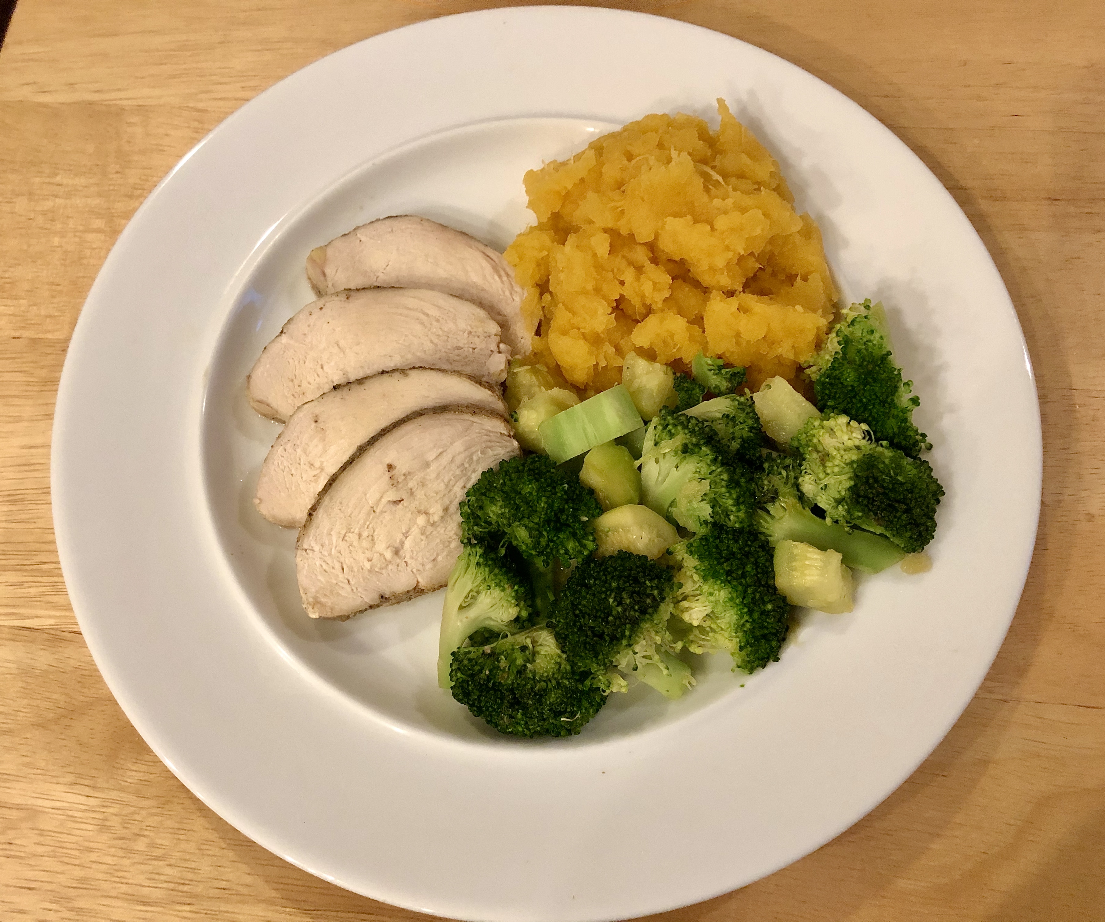 My classic chicken dinner features a sous vide chicken breast, rutabagas made in the Instant Pot, and sautéed broccoli and zucchini. Using our immersion circulator gives us a lot of flexibility for the chicken to wait while I finish off mashing the rutabagas and sautéing the vegetables. The chicken can be enhanced with a variety of sauces. Tonight I used BBQ sauce but I often make chicken gravy with mushrooms or even a lemony butter sauce.