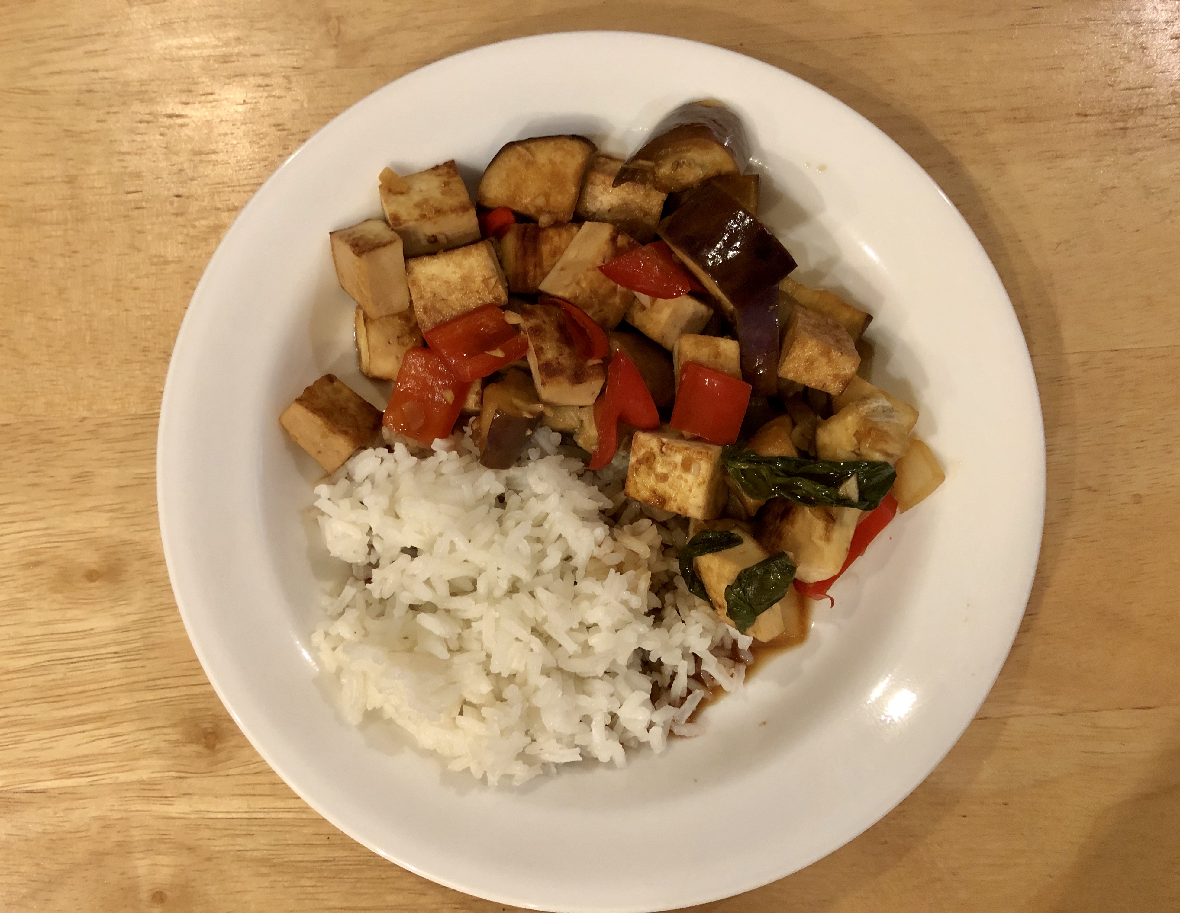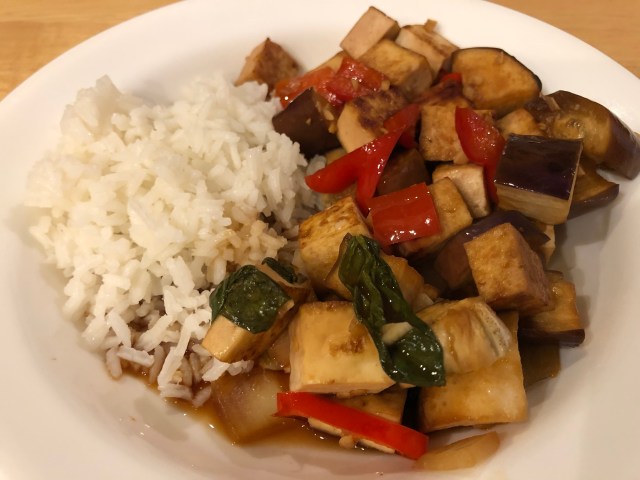 Basically all you do is stir fry Chinese or Japanese eggplant, tofu, red bell pepper, onion, garlic, and a Fresno chili together, add the basil and the sauce and then let it steam together for five minutes. We served it with rice and it was a super, almost vegan (except for a couple drops of fish sauce that you could omit), supper.