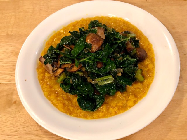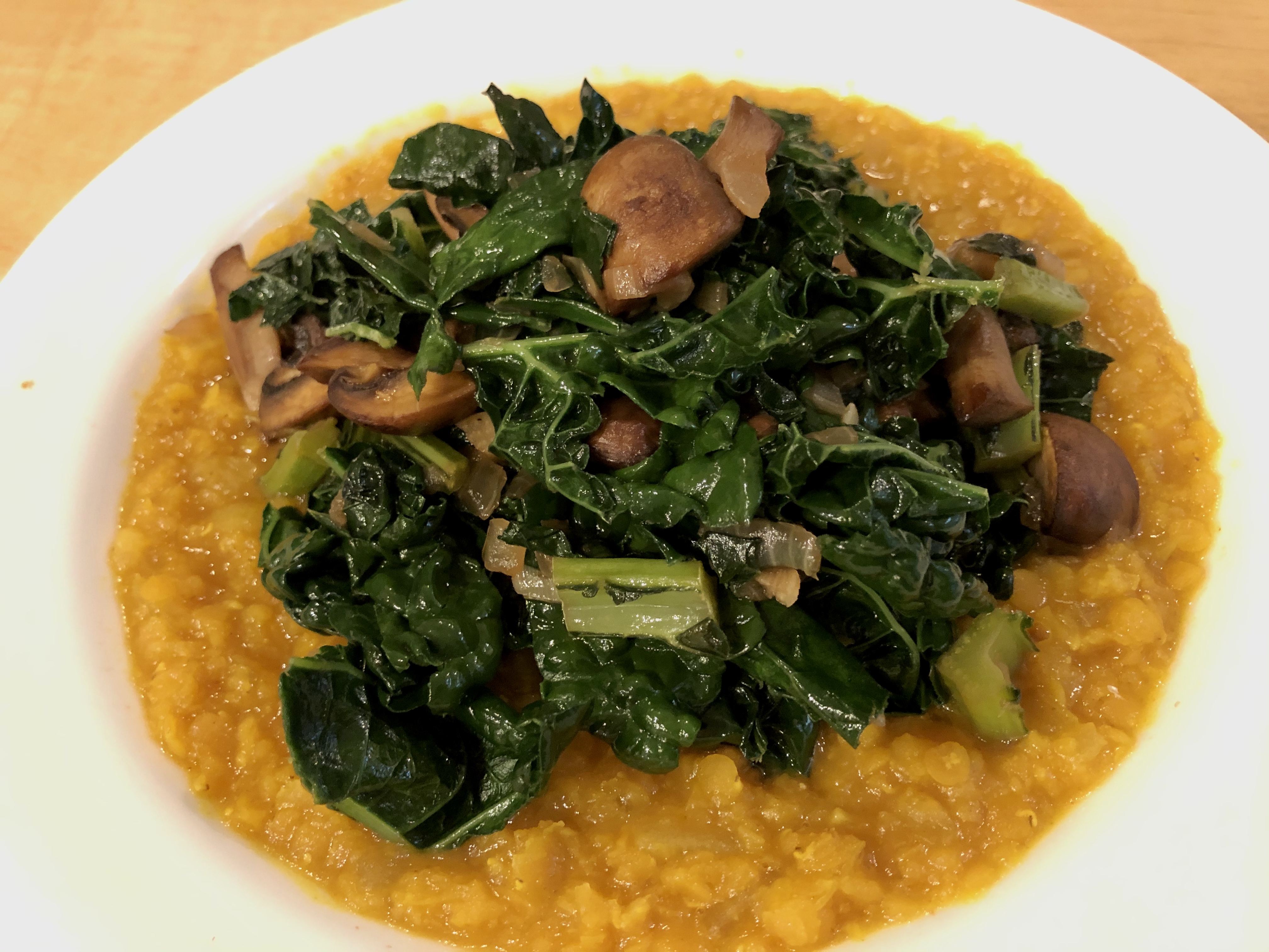We served the lentils with sautéed kale. First I sautéed mushrooms, onions, and garlic. Then I added the kale stems and a little water so the stems could steam. When they were tender I put in the chopped kale leaves and sautéed everything together for about 3 minutes.