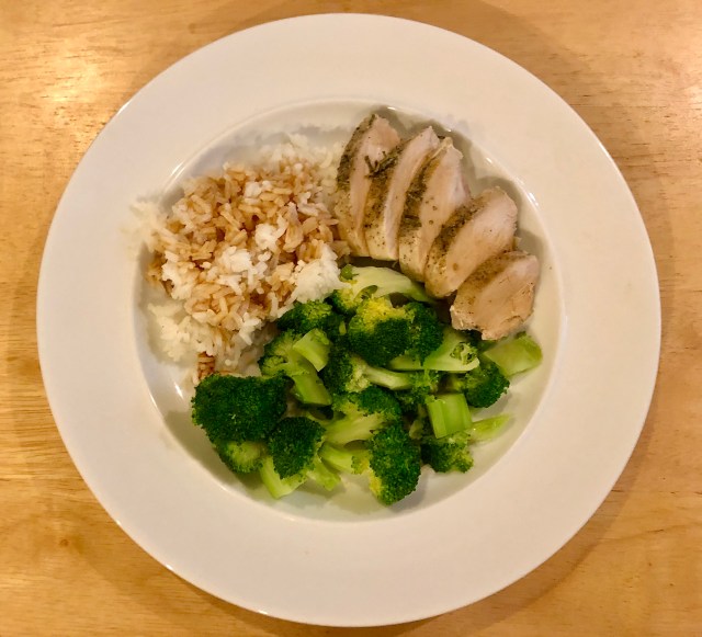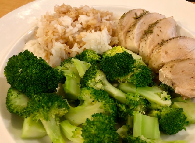 I know it is chicken breast again! Last week to make it a little different I ate the chicken with BBQ sauce. This week I ate it with soy sauce. At first we were going to have rutabagas instead of rice but it turned out that they were so woody that we had to throw the whole lot of cooked rutabaga out. That made me angry! Luckily John had made some rice earlier in the day for some concoction he was having for lunch so at least we had a last minute back-up.