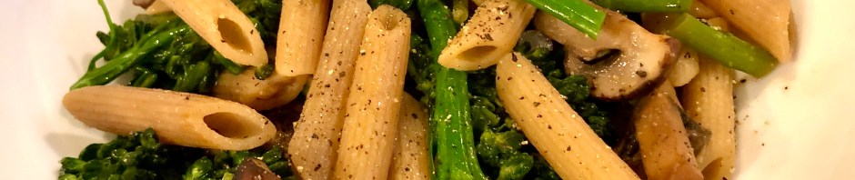 I really enjoy eating a big bowl of pasta but my healthy eating plan wants me to eat fewer carbs. What to do? First, select a whole grain pasta and second, make a sauce which is loaded with vegetables – your eyes will see a big bowl of pasta, your tummy will be satisfied, and your psyche will be happy. Our pasta contained about a 2 ounce penne portion for me with a load of onions, garlic, mushrooms, and broccolini stems and florets. The sauce was made with pasta water and a drizzle of olive oil. Win, win, win!