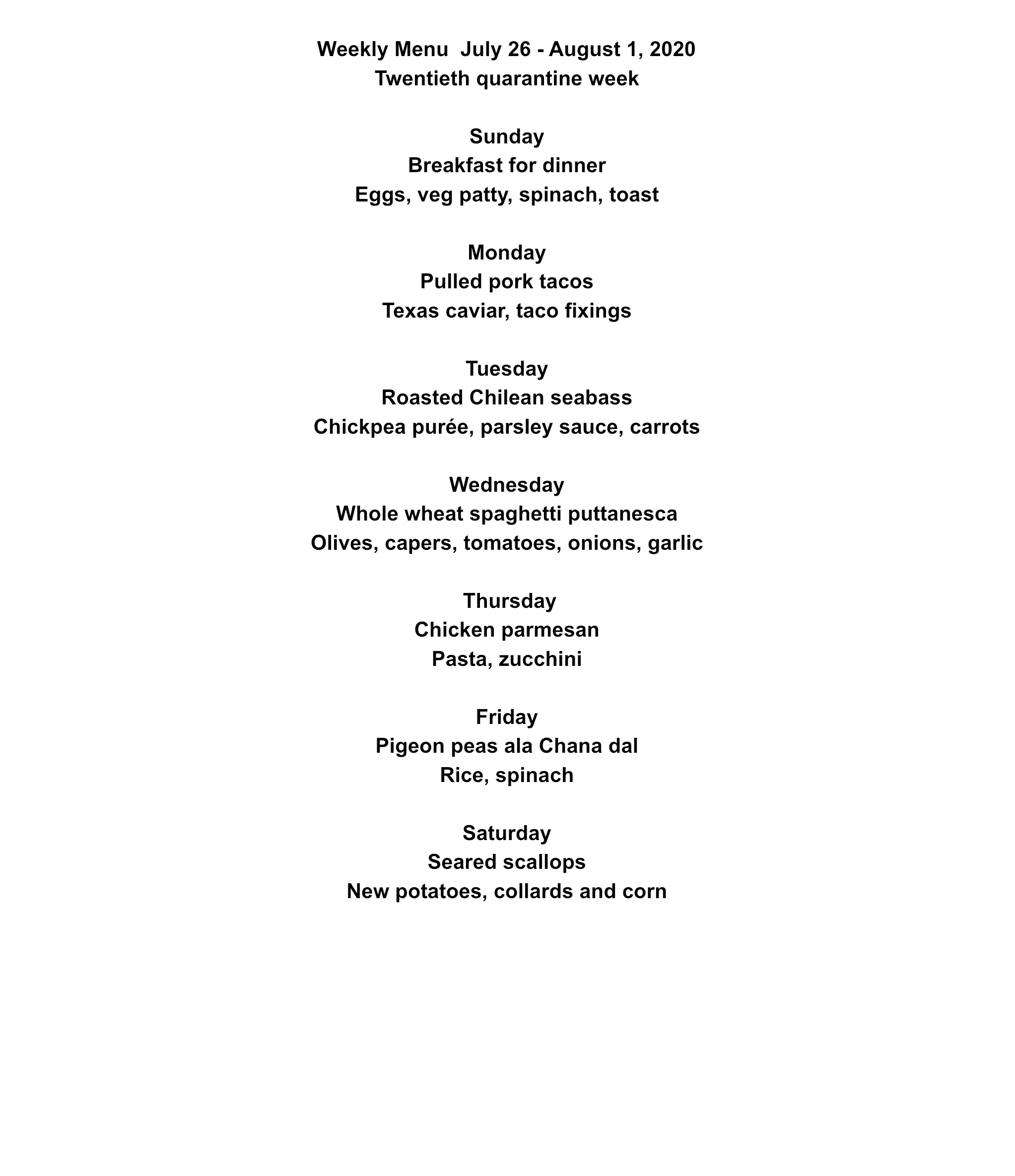 If there is any upside to this pandemic it is that it has been a great boon to my diet. Hopefully this week I will pass the 50 lbs. lost mark. Not being able to travel or eat out means that all our meals are under our control and there is much less temptation. And speaking of temptation, John and I have crafted a pretty tempting menu for this week.