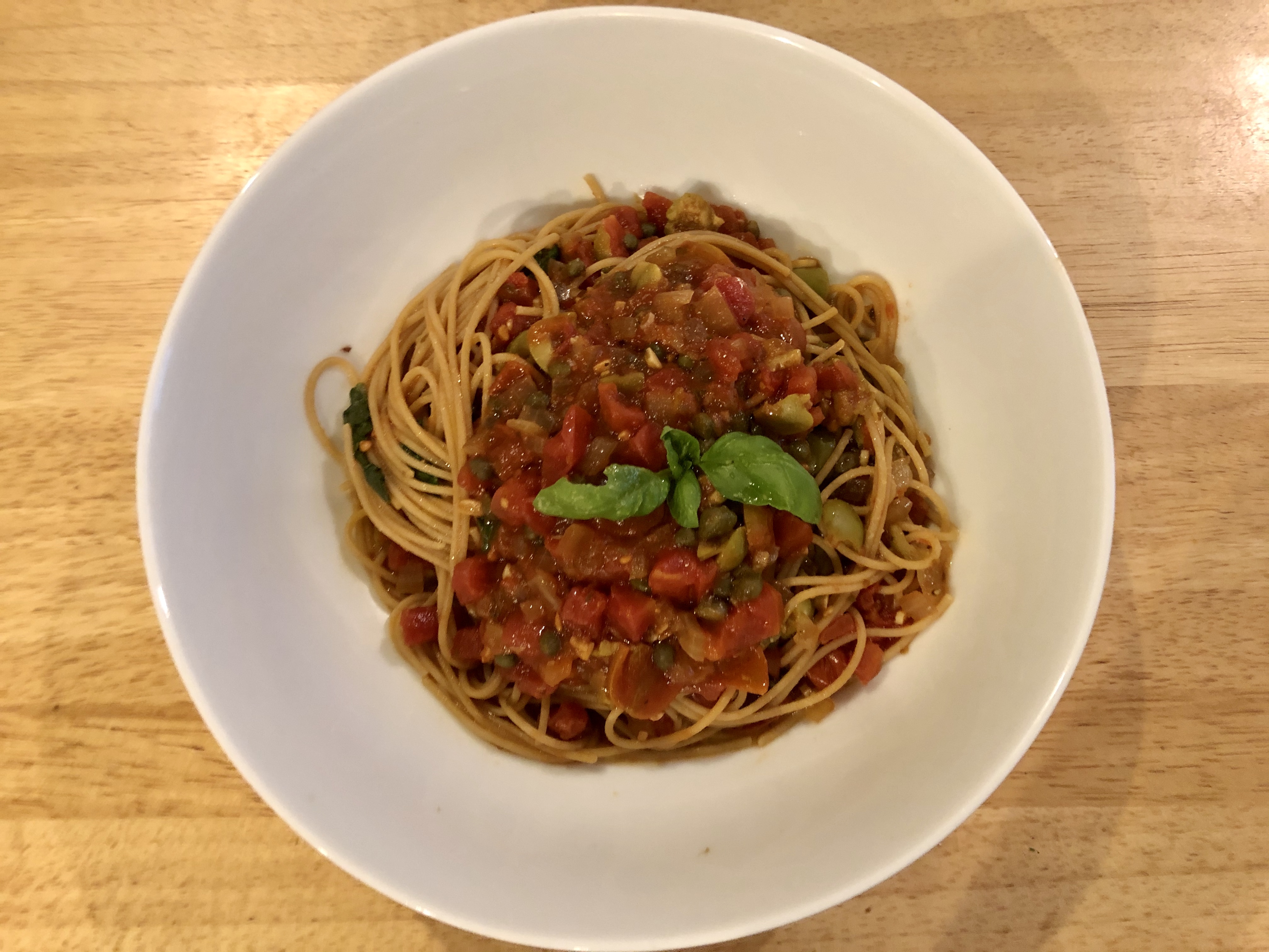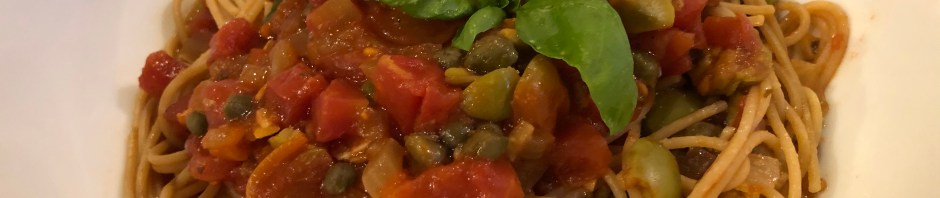 This is without a doubt one of my favorite vegan dishes! I ate lightly all day so that I could have three ounces of whole grain spaghetti with the yummy, salty tomato sauce laden with chile flakes, olives, and capers. I did not use oil in making the sauce so I drizzled some over the top. I left my plate completely vegan while John shaved some cotija on his. (He says that it tastes like ricotta salata!)
