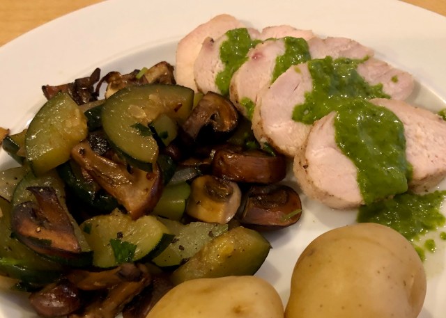 Tonight’s chicken dinner was enhanced with the parsley sauce we made for the sea bass the other night. It is great when you can use a sauce for more than one dinner. The chicken itself is a little bland so having a sauce really stepped up this dinner. The zucchini are the first ones from our daughter’s garden and the combo of the onions, mushrooms, and olive oil gave the vegetables some extra sweetness. Even though we only had about 5oz. of potatoes between the two of us, they rounded out the dinner nicely.