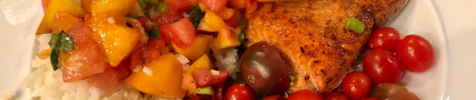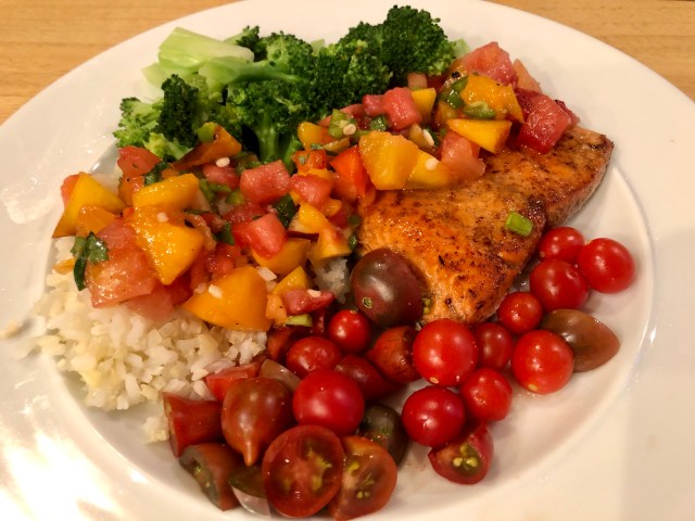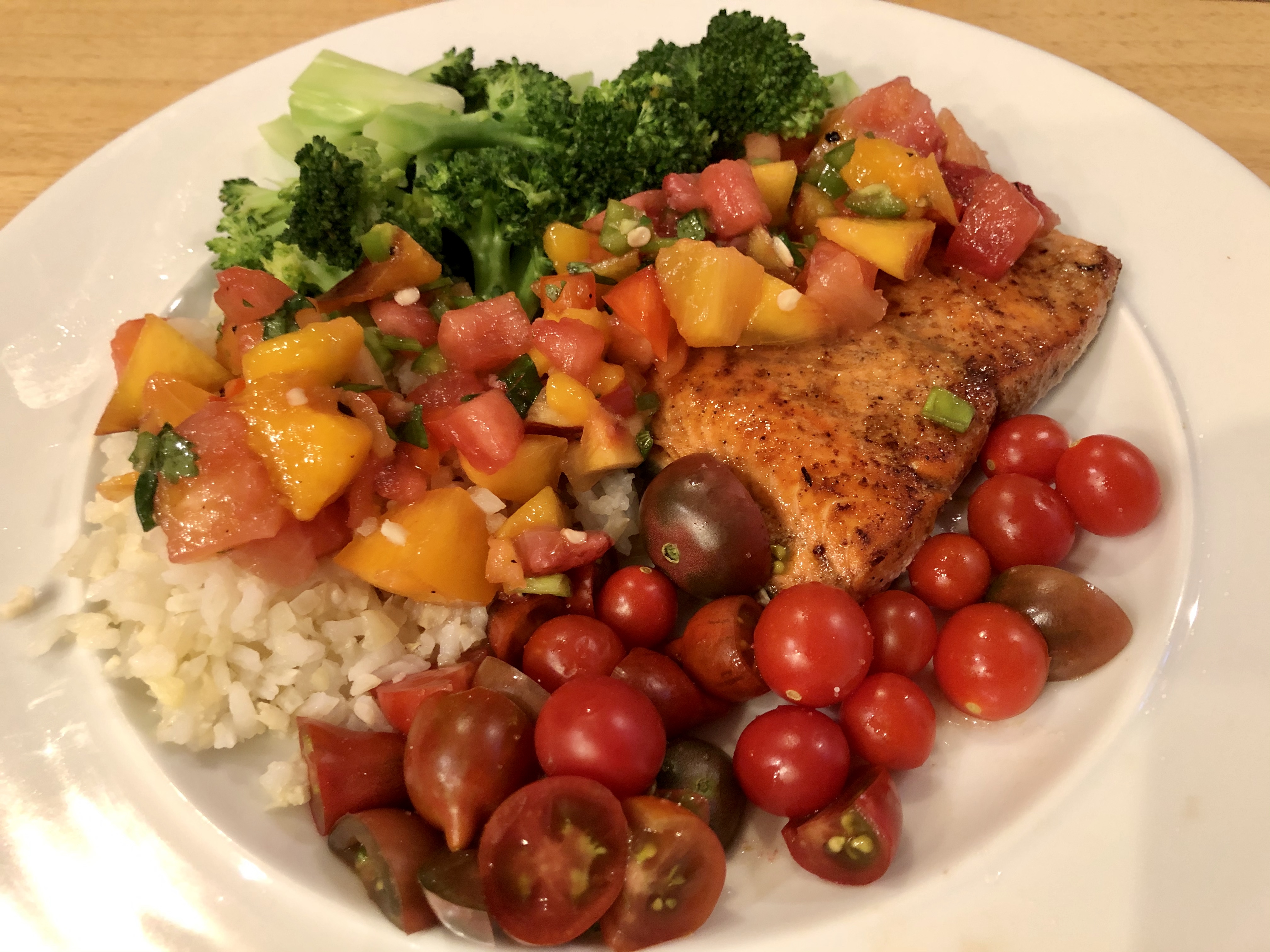 John said, first thing, that salmon was not a fish you find in the tropics. This was followed by broccoli not being a tropical vegetable. Undaunted I continued with my plans and I think that this colorful plate looks inviting and tropical! The inspiration for this dinner came by way of a lot of leftover fruit salad that I made for brunch with our son’s family on Sunday. It had mango, watermelon, strawberries, pineapple, apples, blueberries, and nectarines in it. I picked out the blueberries and apples which are definitely not tropical and added a Serrano chile, cilantro, green onion, and salt. It went well with the salmon and everything on the plate. Even though we cannot go to the tropics, we can still eat like we are on vacation.