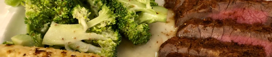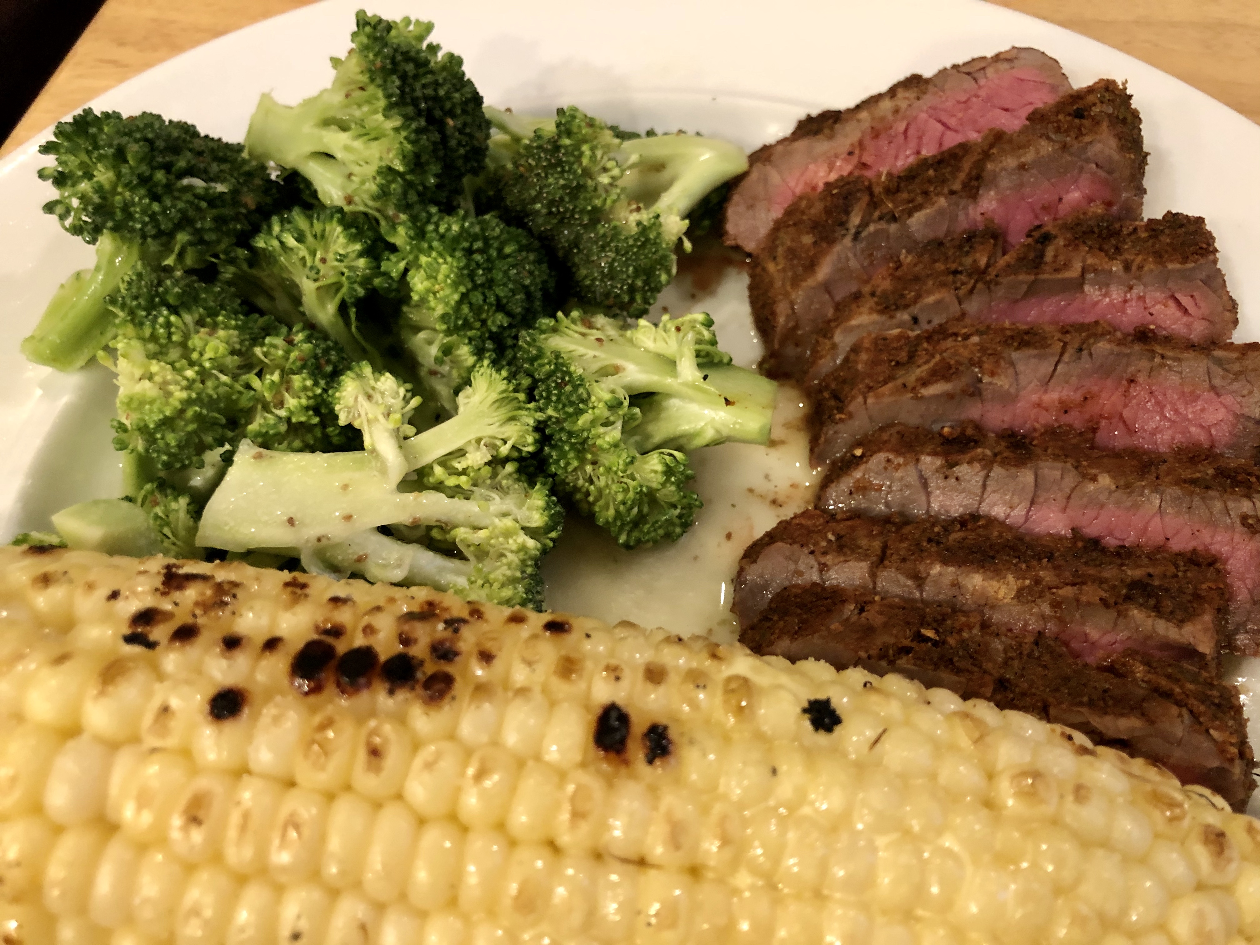 Grilled flank steak, broccoli salad, corn on the cob, and red wineJohn and I used to enjoy wine with dinner most nights but since we have been on our weight loss regime for the last 11 months we have limited ourselves to a very occasional glass. So anytime we are having wine is a special treat. And anytime we eat beef is also a rarity as well. Tonight we enjoyed ourselves with a grilled piece of spice rubbed flank steak, a celery seed broccoli salad, grilled corn on the cob, and a 2015 Malbec from Imagery Winery.