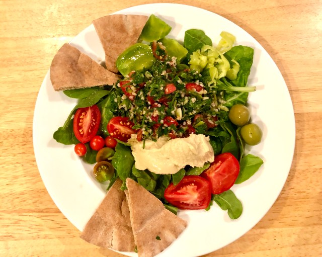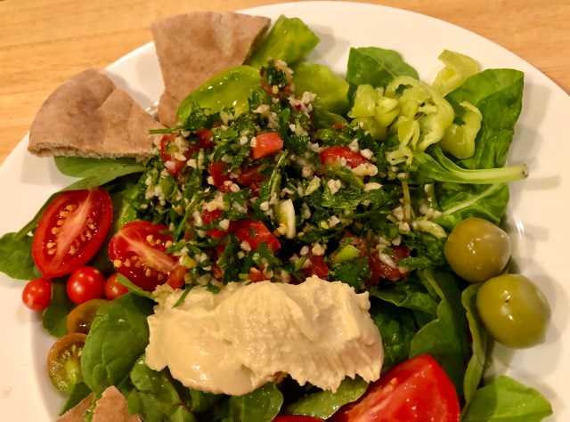 Our Mediterranean dinner tonight was a combination of store bought and homemade components. I made the tabbouleh but just assembled the rest. This is a Lebanese style tabbouleh with the emphasis on parsley rather than the bulgur. Using a food processor to chop up the parsley, mint, scallions, and garlic leaves you with only the tomatoes to do by hand. I bought the already washed salad greens, olives, pepperoncini, and pita so my biggest task was just assembling everything on our plates. We are under an excessive heat warning here so this no-cooking dinner kept our kitchen cool.