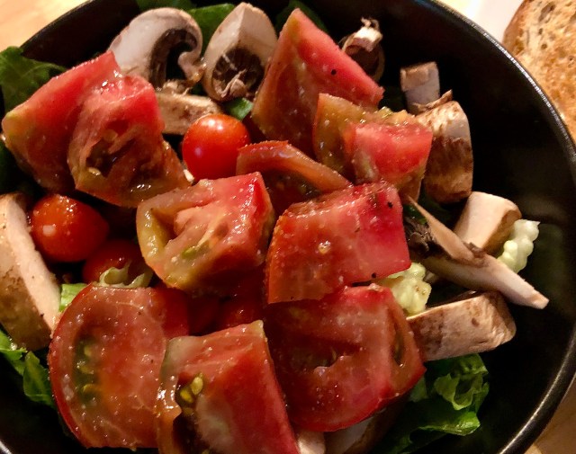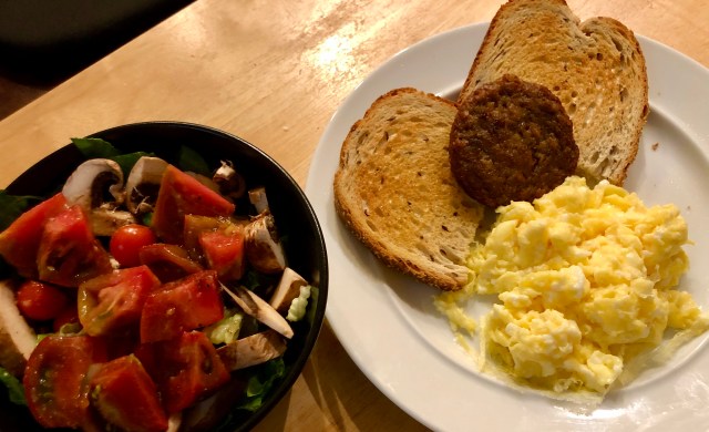 As usual we are having breakfast for dinner on Sunday night. John and I go our separate cooking ways with him always making a omelet and me usually making some sort of scrambled eggs. I have been hungry today so I knew I needed a lot of components to my dinner so it would not be over with so fast. Having a salad with dinner (as much as I hate making salad) is a good way to add some filling food. Since we have all these fabulous tomatoes from our daughter’s garden, the salad making chore is less onerous. I scrambled up a couple of eggs and microwaved the veggie patty. I see the label on the patties says they are vegetarian not vegan but I am okay with that. I spray some butter spray on the toast to make it more palatable. Voila, dinner!