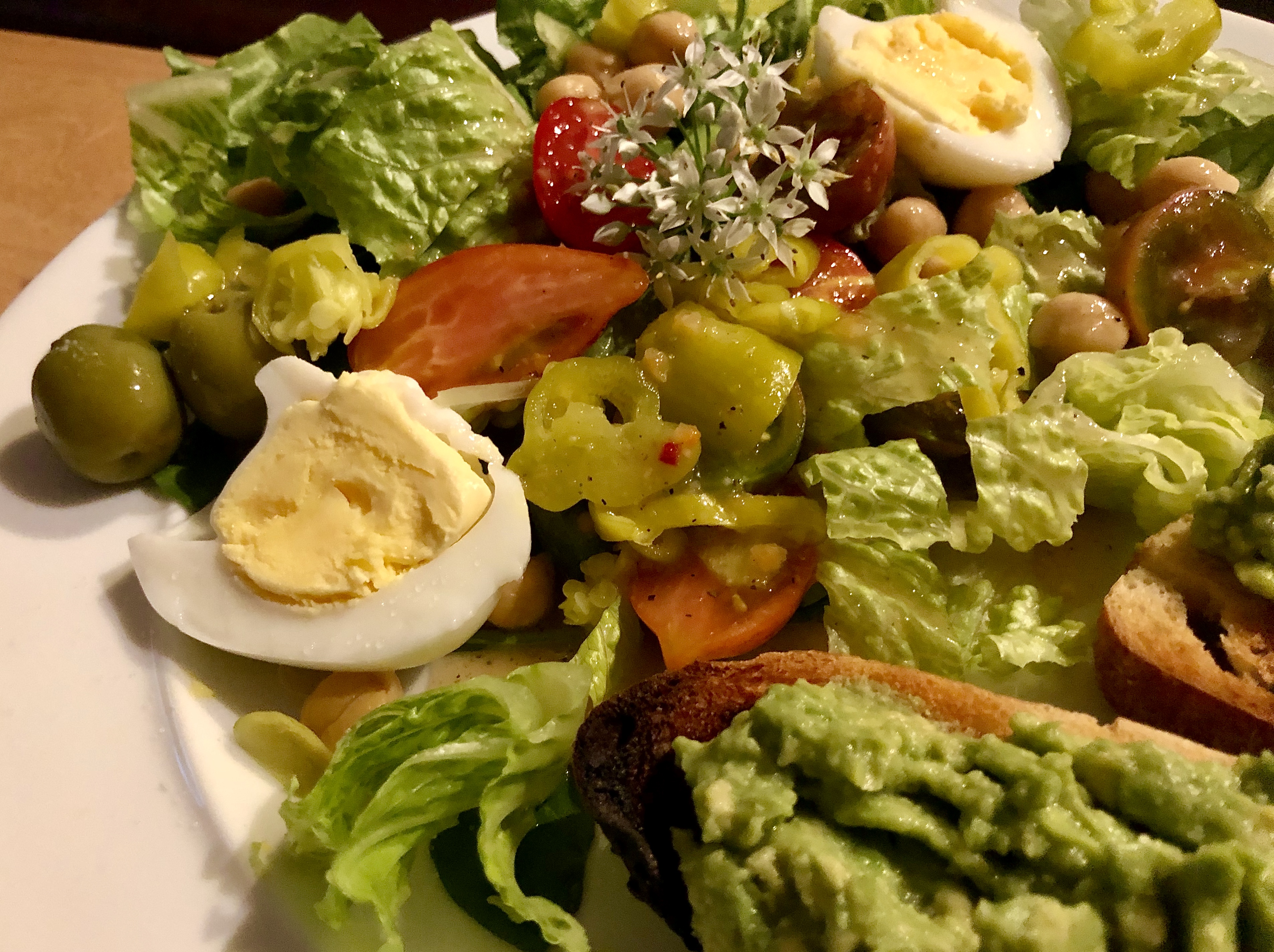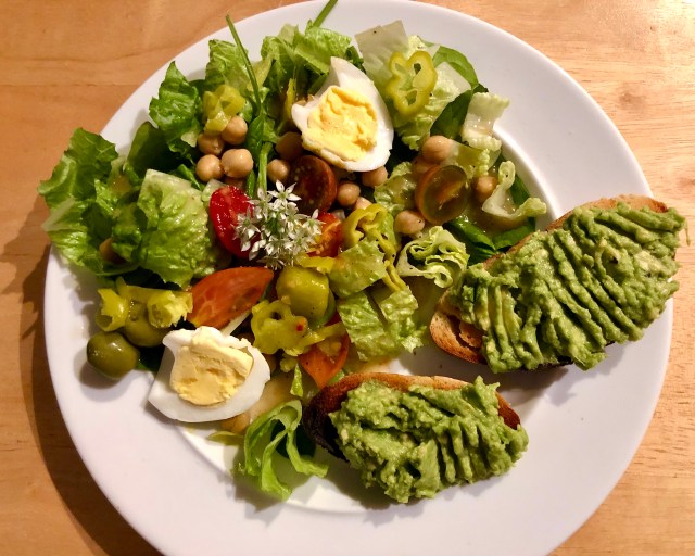 Our trendy dinner features avocado toast and a dinner salad. Avocados were 2 for $1 at the local grocery and seemed too good a buy to pass up. Unfortunately, although they were ripe, they were not very flavorful. I dressed my mash with lemon juice and plenty of salt and pepper but they just were not as good as I had hoped. The dinner salad that I made was based on the premise that the avocado toast was not going to fill us up. I figured including a hard boiled egg and some chickpeas would help with satiation. Dinner was colorful and for the most part quite tasty.