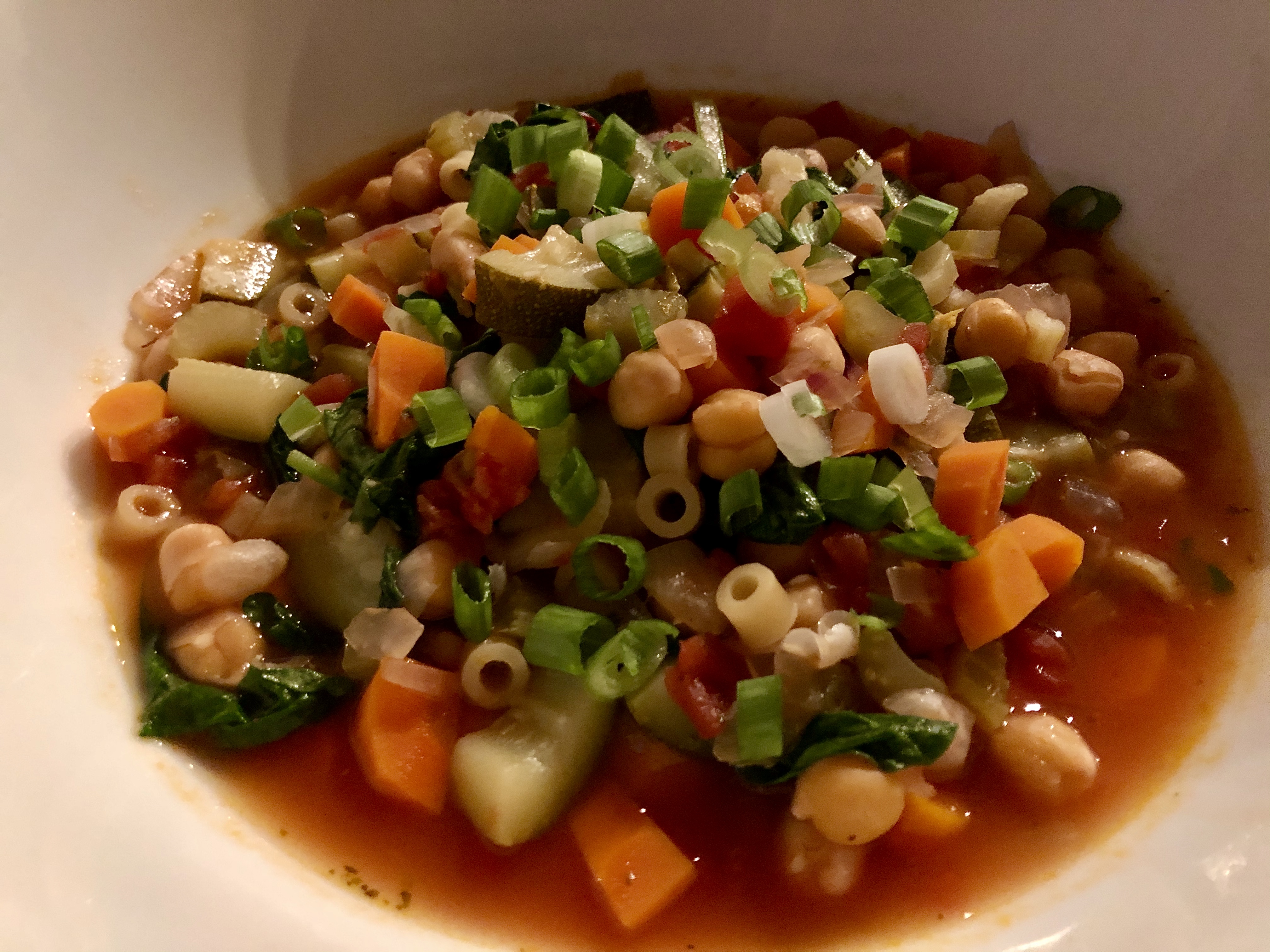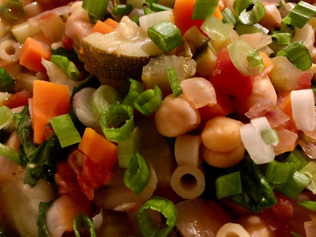 Each time we make this dinner it is a little different from the last time. This time we added a can of tomatoes with chiles which gave it a nice zing. Sometimes we add fennel instead of celery, this time we added celery and zucchini. Our finishing greens vary as well—kale, or chard, but tonight I was lazy and just bought a container of mixed hearty greens. So what I am saying is chickpea stew/soup is endlessly variable and always a welcome addition to the week’s menu.