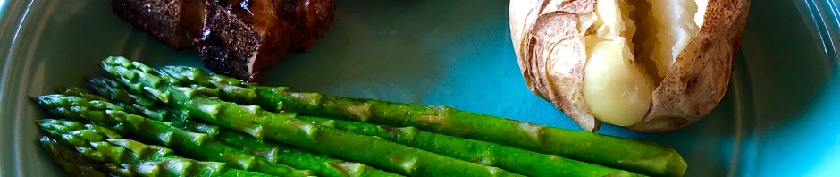 Since we do not have a reliable cooktop here John broiled the lamb chops in the oven, I microwaved the potatoes, and I only used the cooktop for the asparagus. Our daughter scooped out her potato and made it twice baked style with butter, onions, and cheese. I think we all enjoyed this change of pace dinner.