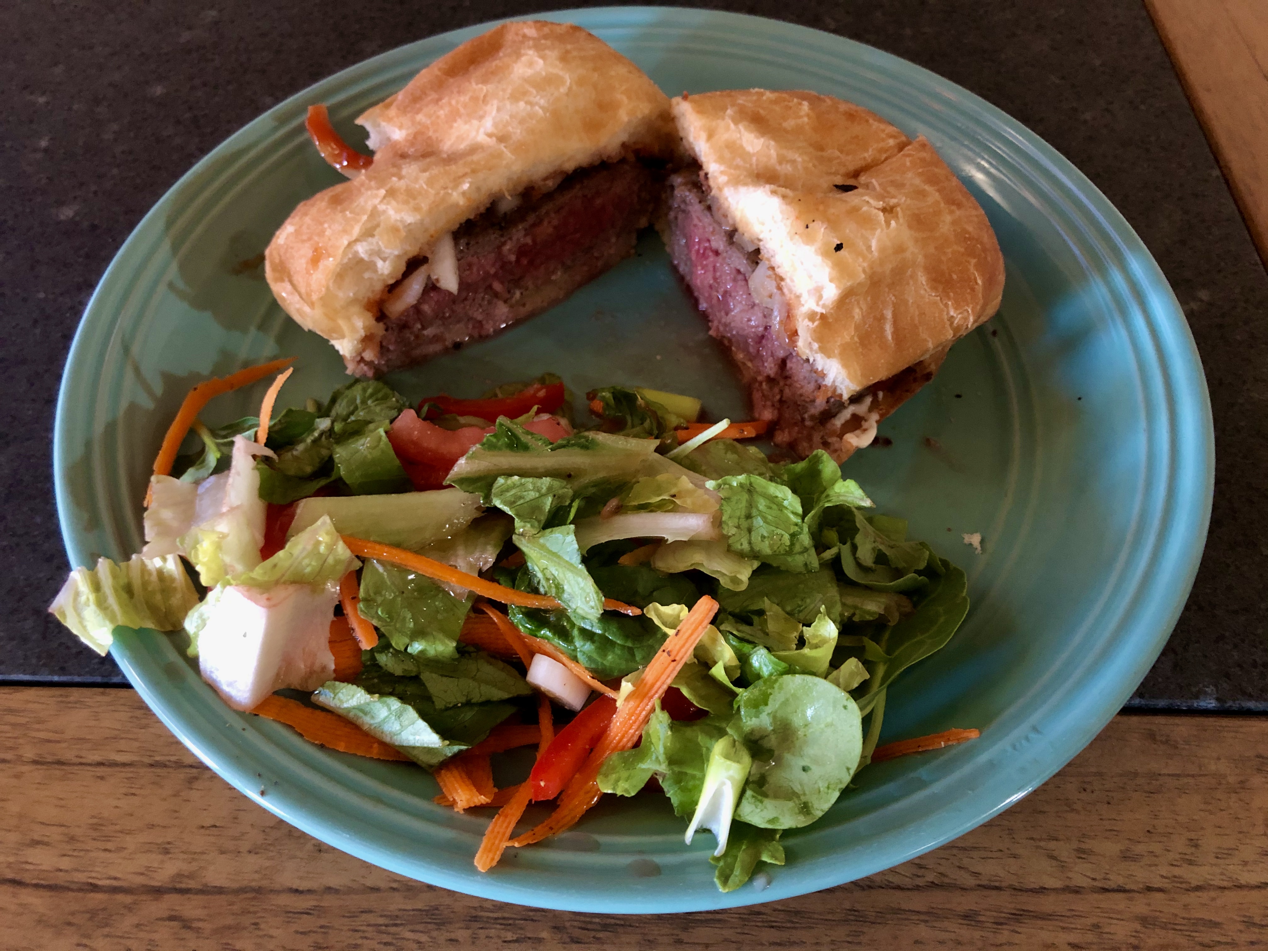 This is the first actual hamburger I have eaten in 11.5 months. Yes, I have had a couple of very low fat burgers on pita or a diet bread product a couple of times but there is really no comparison. This was a juicy hamburger on real bread!