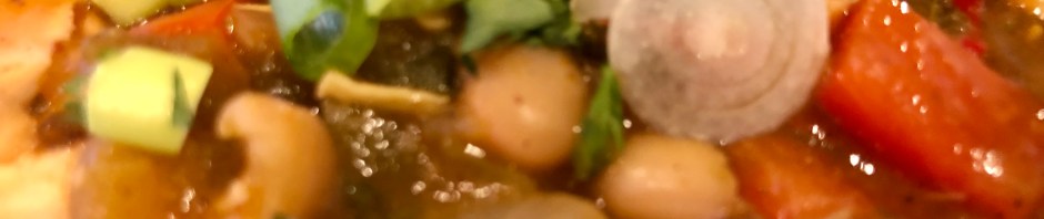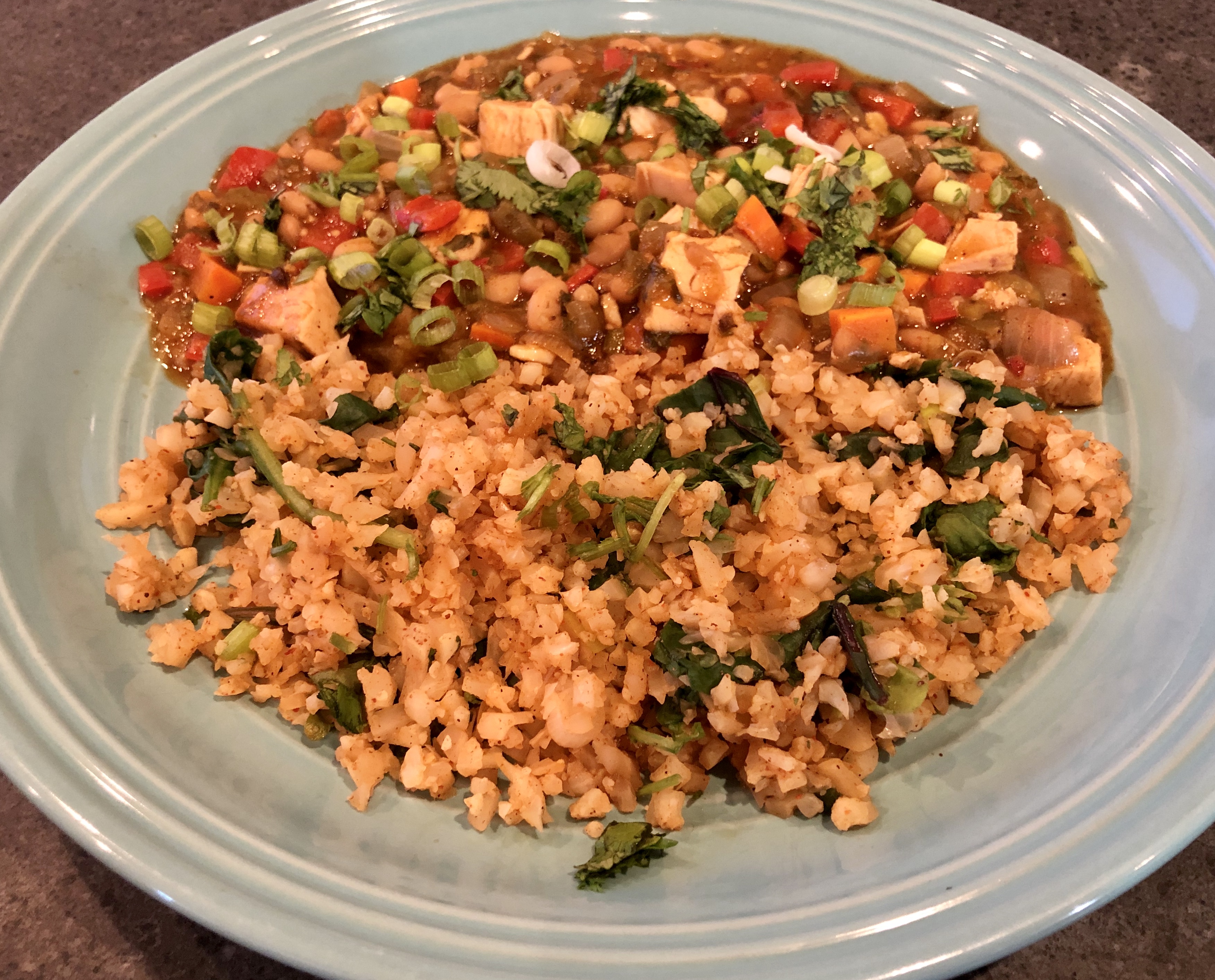 This is our last night before returning home so we need to use up as much as possible from the refrigerator. I chop up onions, bell pepper, and garlic, the Fresno chile, and a carrot for sweetness. We add the beans, the salsa verde, and some chicken stock. Taste, adjust, taste again. It does not come out great but is an approximation of chile. John puts crumbled corn tortilla chips on his. I try to coax out some umami flavor with a packet of soy sauce. I also make cauliflower rice with the rest of our “power greens.”