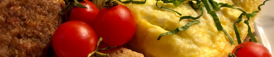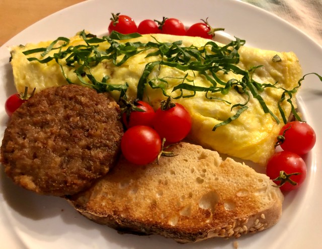 Normally for BFD I just make some sort of scrambled eggs. Last night I tried to be a little more creative and it turned out really well. The omelet I made consisted of two eggs, a slice of ultra thin Swiss cheese, spinach, and mushrooms. In addition on my plate is a veggie patty, a slice of our daughter’s homemade sourdough bread, and some of her garden cherry tomatoes.