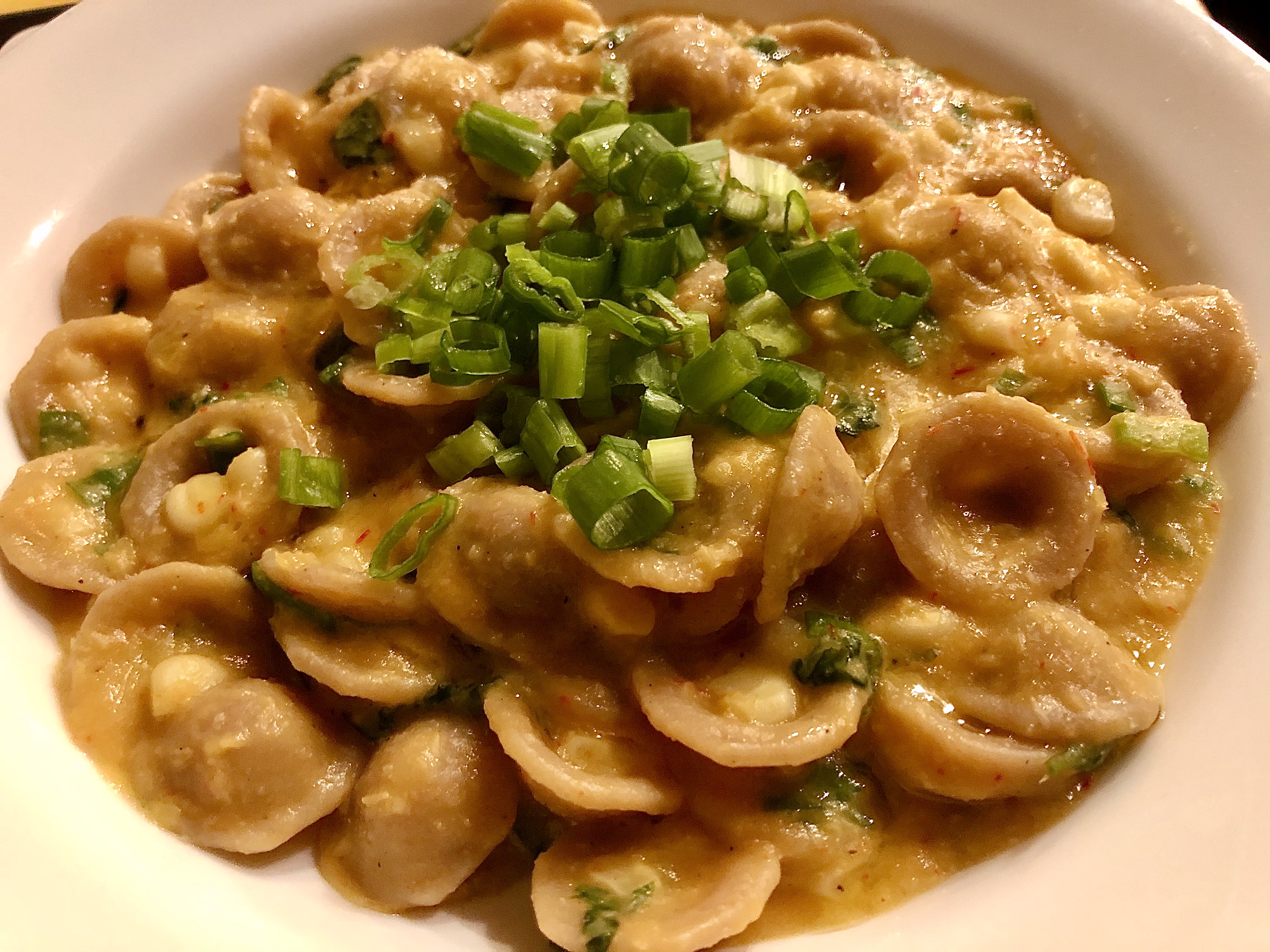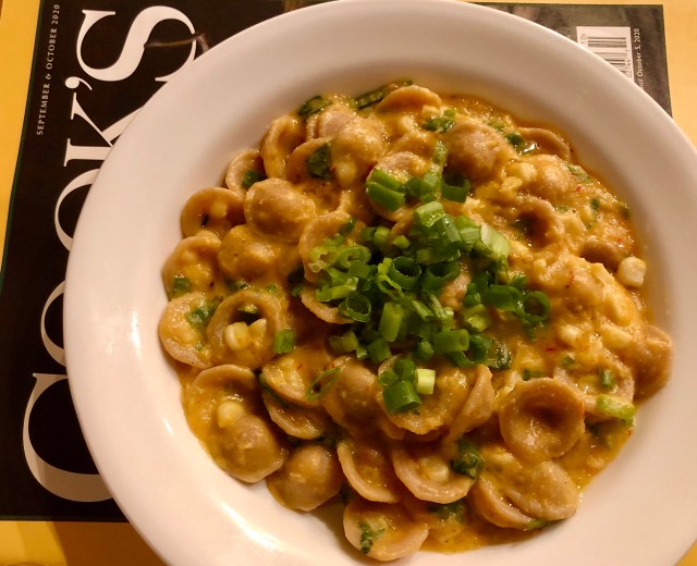 This creamy pasta dish has no dairy in it at all as long as you exchange the butter for oil and omit the parmesan cheese. The creaminess is basically due to some water or vegetable stock puréed in the blender with corn kernels. The recipe comes from Melissa Clark at NYTimes Cooking. You can open it if you have a subscription to the site.