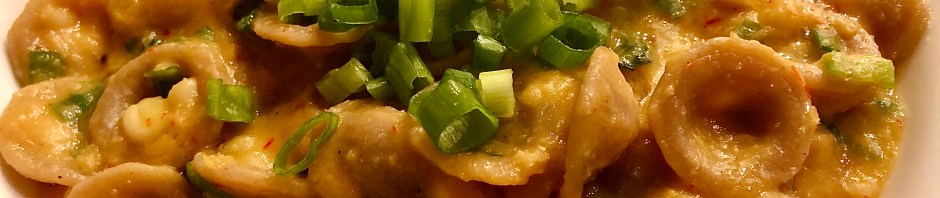 I used fresh corn but I think you could probably use defrosted frozen kernels with much less mess. I also puréed a Fresno chile along with the corn instead of using pepper flakes which gave the sauce an orange-y look, kind of like lobster sauce. I also feel like you could use regular onion and save the scallions for garnish.