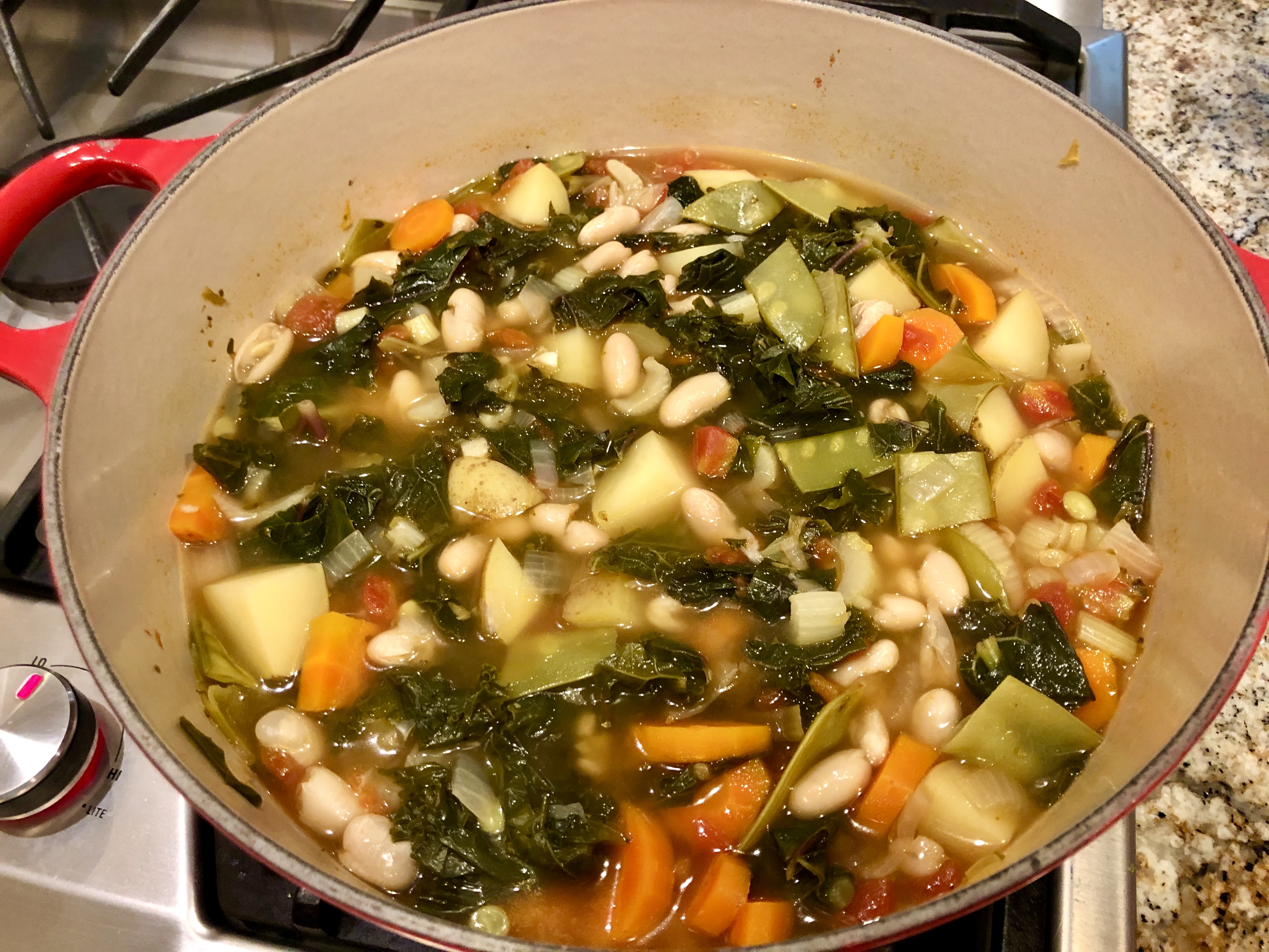 While I was busy not cooking I decided to make some Vegan vegetable soup to have for lunches during the weekend. I had quite a few tired vegetables in the refrigerator so it was everybody into the pool! Onions, carrots, parsley, celery, potatoes, canned tomatoes with chiles, snow peas, white beans, and kale all contributed to the soup. I herbed it up with fresh thyme, dried oregano, and a bay leaf. I used water, vegan broth, and the liquid from the tomatoes for the soup broth. It actually turned out more like a vegetable stew than a soup. It tasted good yesterday but even better today! I have three quarts in the refrigerator.