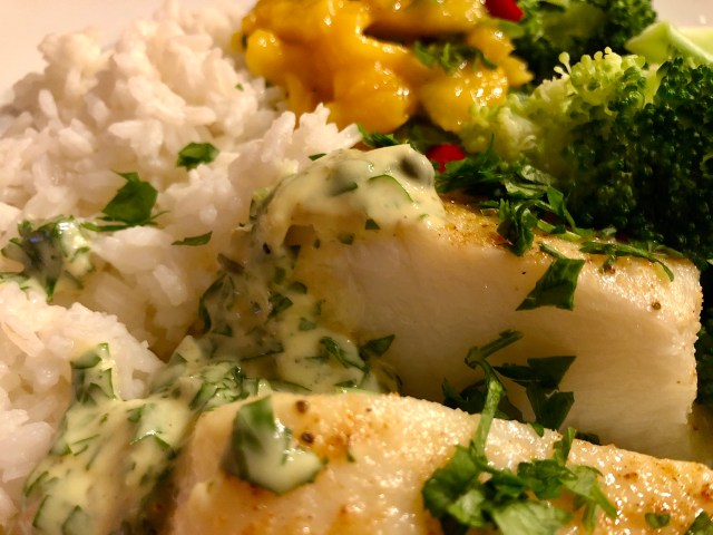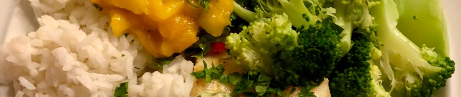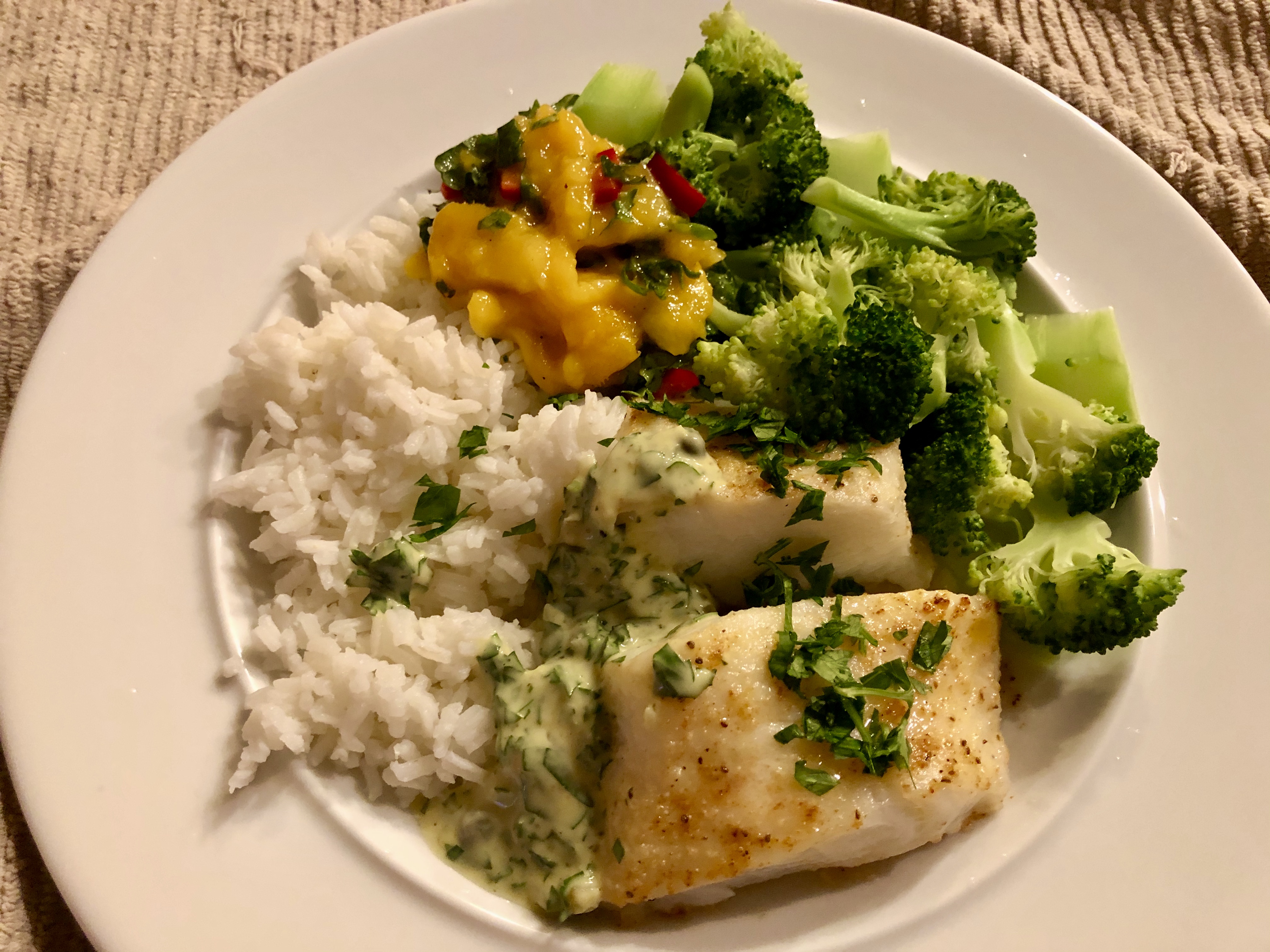 John roasted three pieces of sea bass for 12-15 minutes depending on their thickness. How’s that for a fast delicious dinner?! I made a mango salsa to go with the dinner by combining mango, a chiffonade of kale, Fresno chile, lime juice, olive oil, and a sprinkling of basil, tarragon, and mint. It was sweet and spicy. I also made a parsley tartar sauce. John cooked some rice earlier in the day and I steamed some broccoli when the fish was half-way done.
