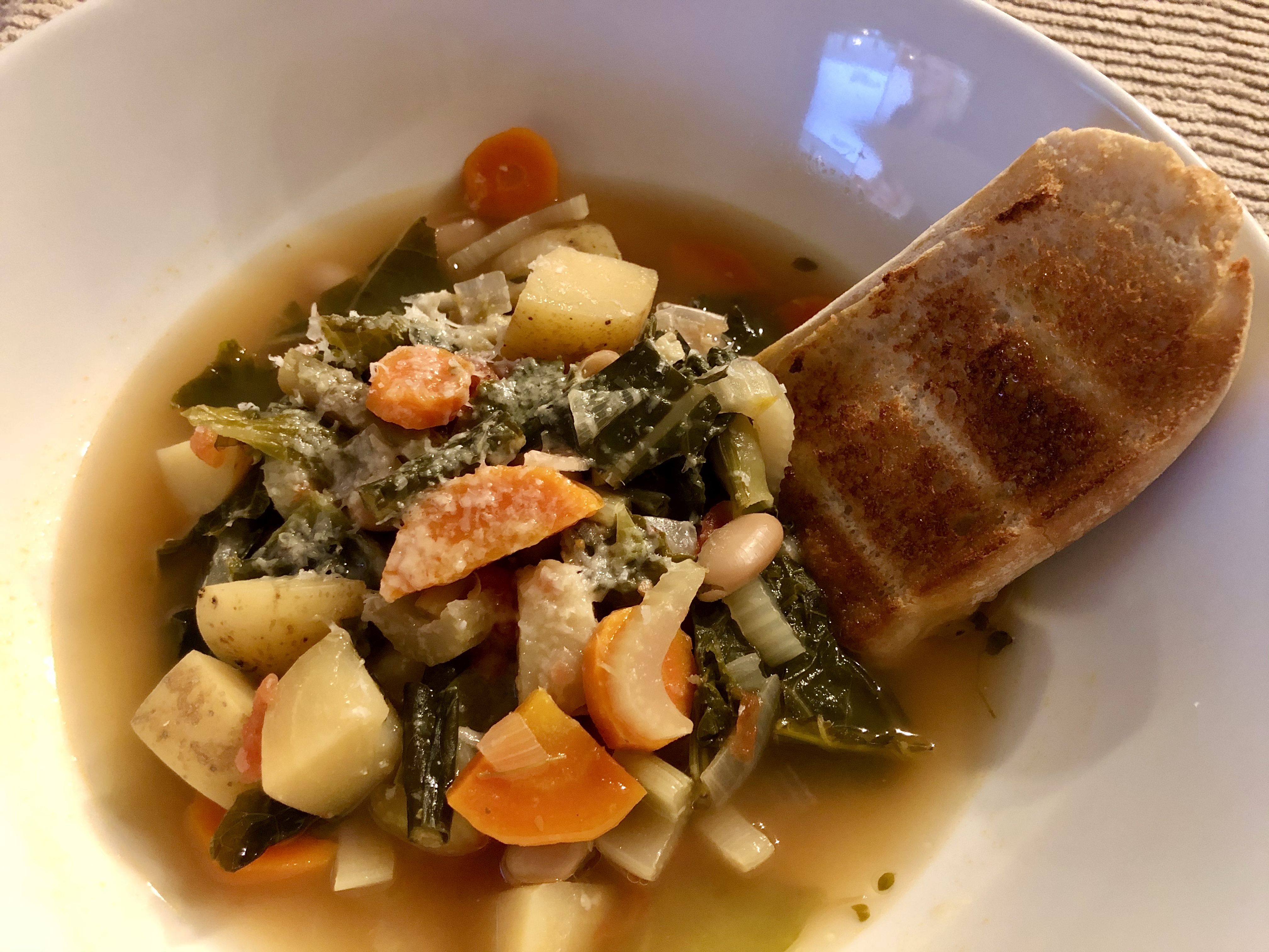 The soup I made the other day and had for lunch transformed itself into dinner. I added more vegetable stock to it which made it soupier and less stew-like. All the vegetables in it are things you probably have in your refrigerator – carrots, onions, potatoes, celery, white beans and tomatoes from the pantry, and any sort of greens. I added some Parmesan on mine at the end but without the cheese it would be a fine vegan dinner. I still have a quart left and I am trying to decide whether to freeze it or have it for lunch tomorrow.