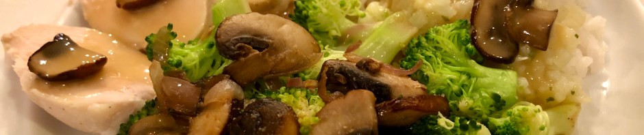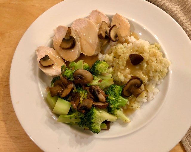 In addition we are celebrating having reached our weight loss goals. John and I have each lost about 50 lbs. on our diet that we started exactly one year ago. So it is a double celebration day. Our treat-yourself dinner is delicious sous vide chicken breast, with mushroom gravy, rice, and broccoli. It tastes great and is part of our healthy eating plan.