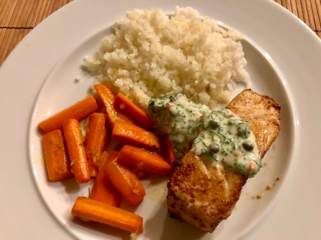 Chilean sea bass with a parsley tartar sauce, glazed carrots, and rice/caulirice mixture