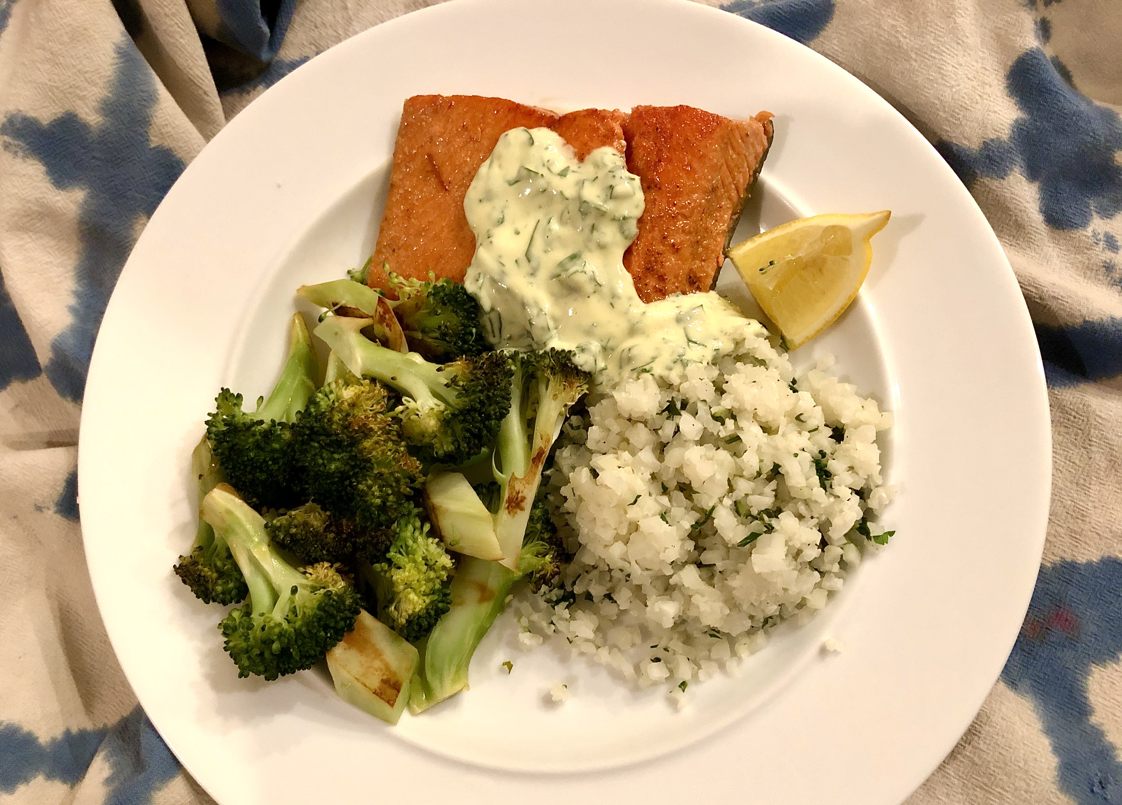 So after our lovely cocktail and pretzel time we tucked into John’s delicious pan-seared salmon with a tarragon sauce that I made. The tarragon sauce is a combo of light mayo, fat free Greek yogurt, tarragon, parsley, lemon juice, salt, garlic powder, and a dash of water to thin it out. It tastes good with the salmon but also on tonight’s broccoli and riced cauliflower.