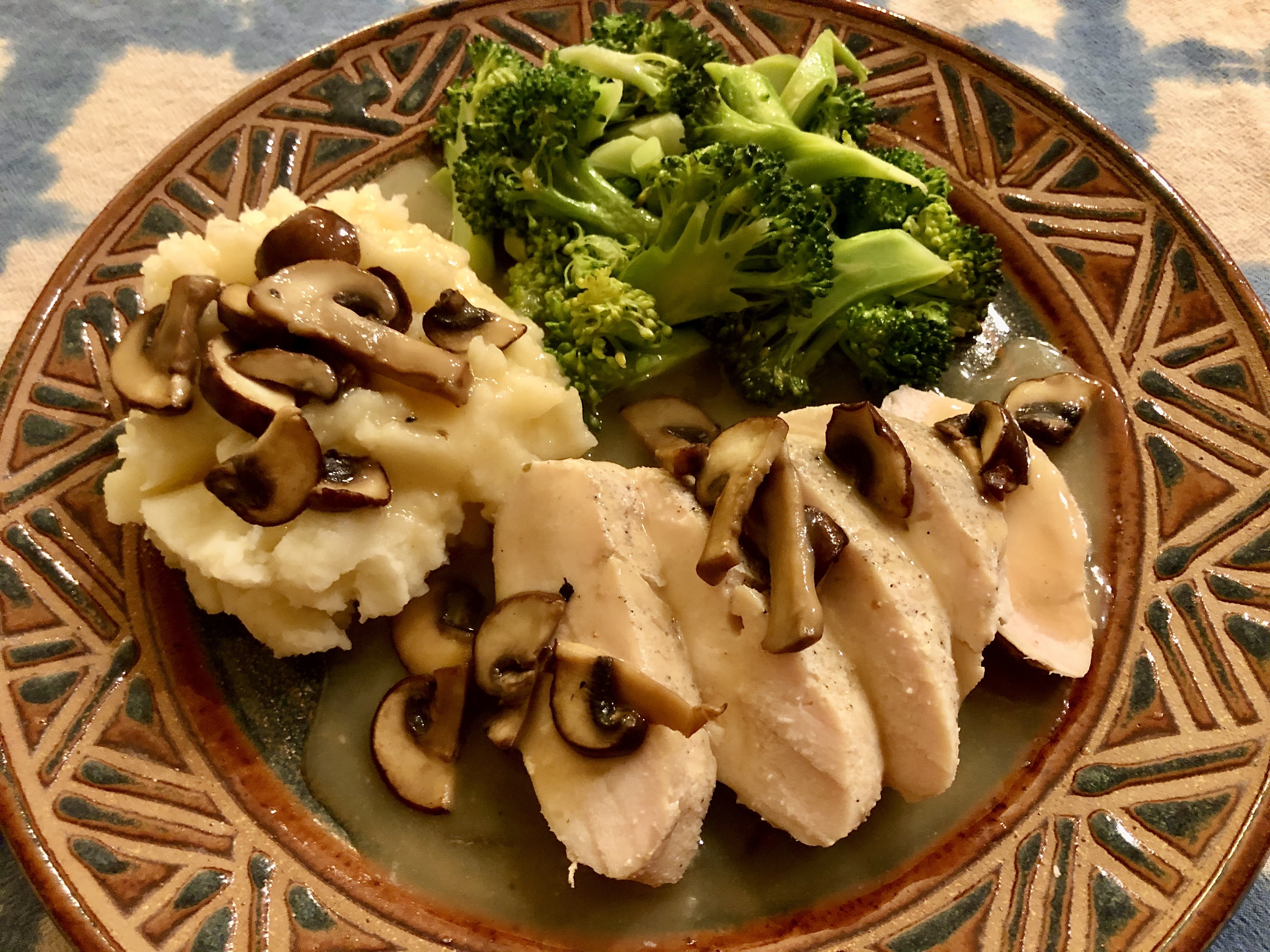 In these roiling times preparing a classic, comforting dinner for you and your family soothes your soul. So tonight we decide to make sous vide chicken breast with tarragon, mashed potatoes with chicken/mushroom gravy, and broccoli. We also pass up watching the town halls by the presidential candidates and opt for reading about it tomorrow. We voted this week so our preference is locked in.